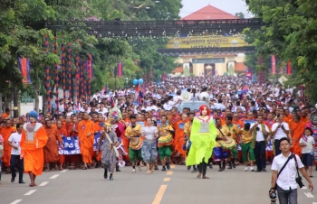 【柬埔寨头条综合报道】据柬媒消息,2025年10月5日,柬埔寨磅湛省政府联合旅游部以及教育、青年和体育部,共同举办了以“为和平而走”为口号的世界步行日活动。此次活动旨在铭记并感谢柬埔寨政府和前线军队在保卫国家领土完整、为人民维护和平方面所作出的努力。 该活动于上午7时至9时举行,全程约4公里。步行队伍从磅湛省独立纪念碑出发,途经船舶论坛后返回。 出席此次盛包括旅游部长胡海、磅湛省省长翁占达等多位省级领导,以及250名僧侣、居民和学生在内的近6000人参与。 本次“为和平而走”活动,旨在提升和维护柬埔寨及全球的和平精神。 (编译:影子) |