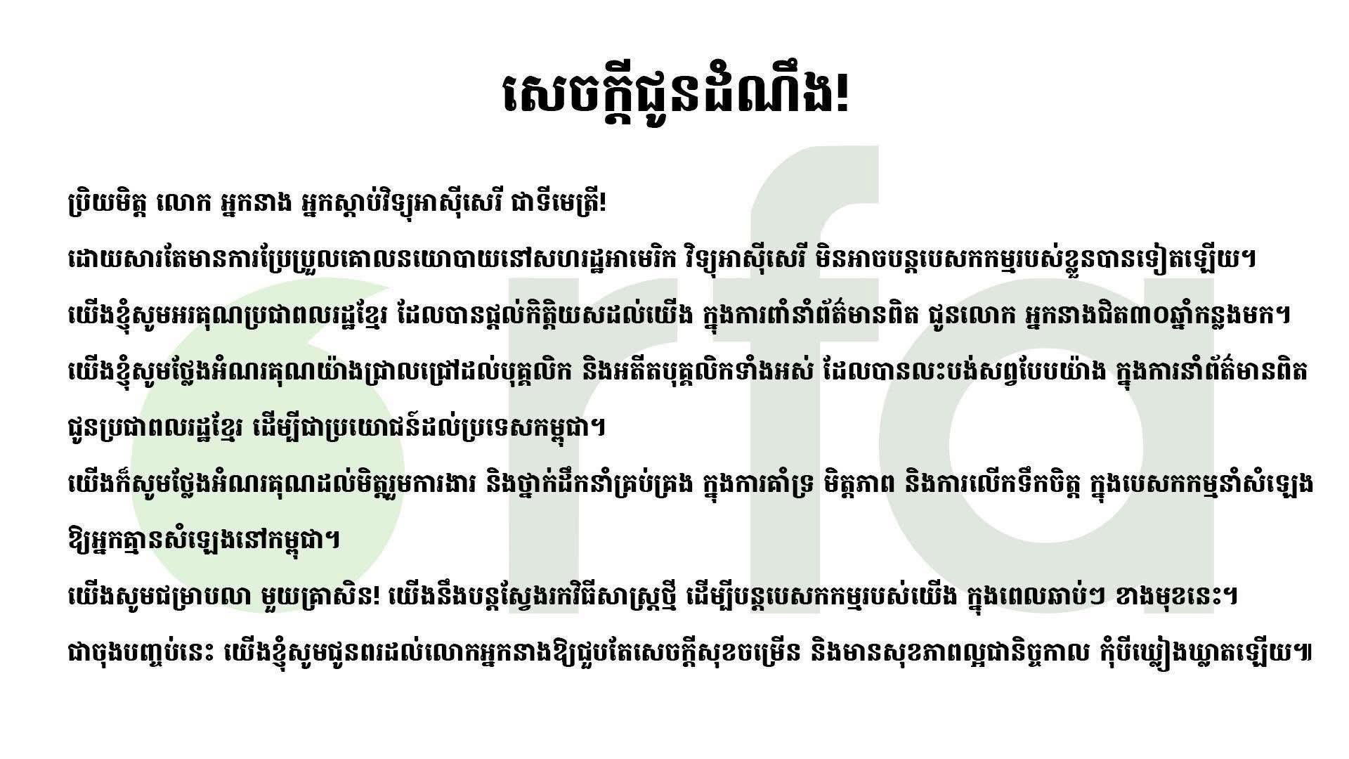 【柬埔寨头条综合报道】据柬媒消息,自由亚洲电台(RFA)柬语频道于10月8日晚发布声明,宣布因美国政策调整,即日起正式停止播出。在声明中,RFA柬语频道表示:“由于美国政策的变化,电台已无法继续履行其使命。我 ...