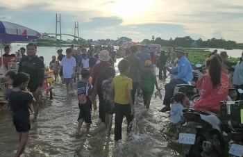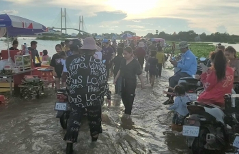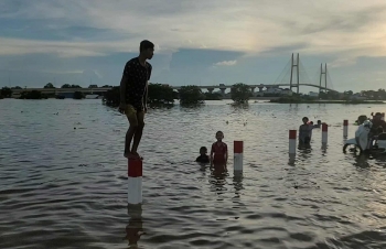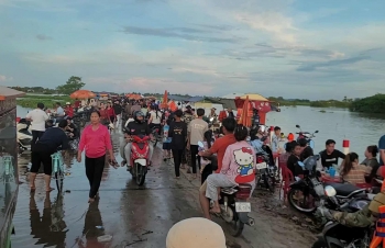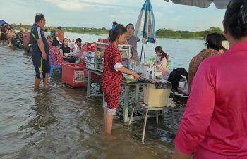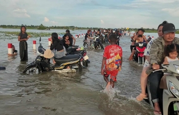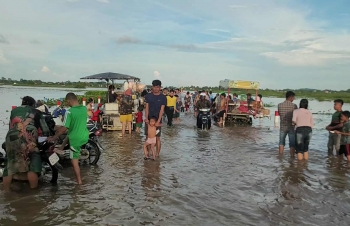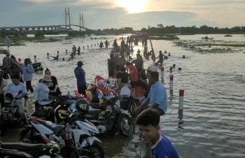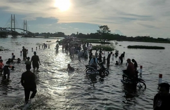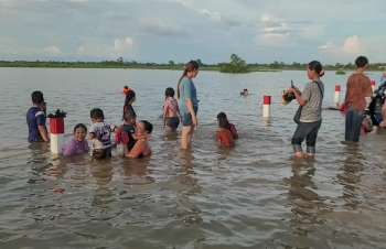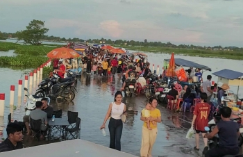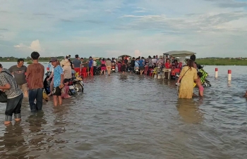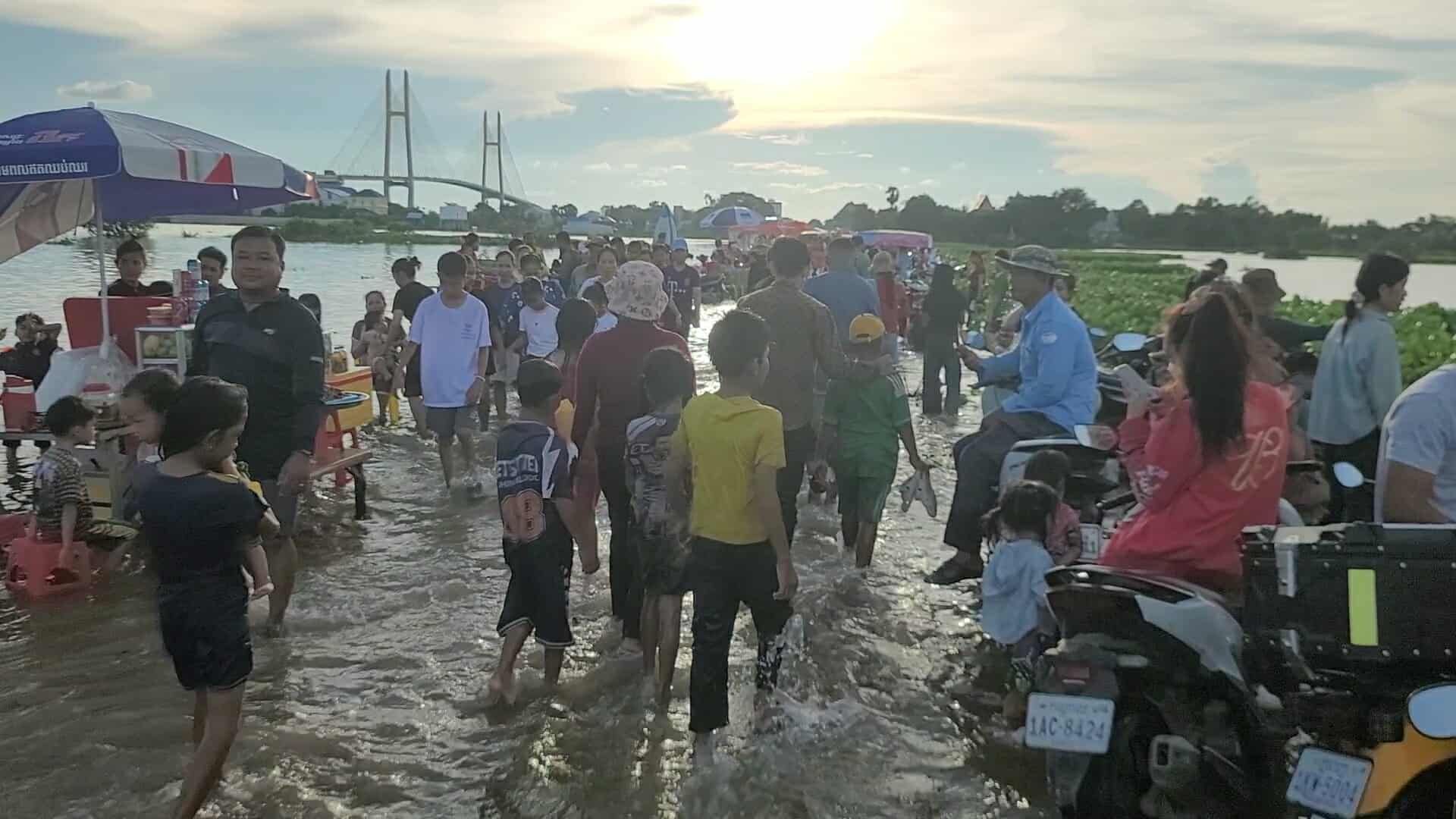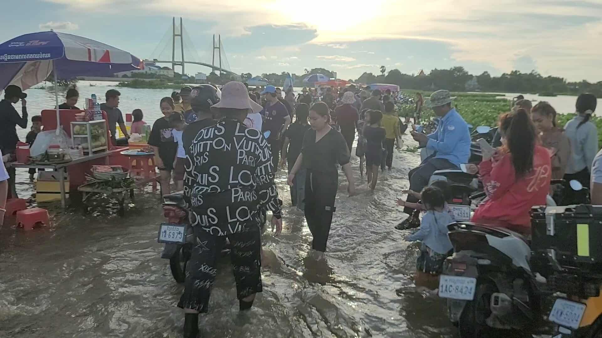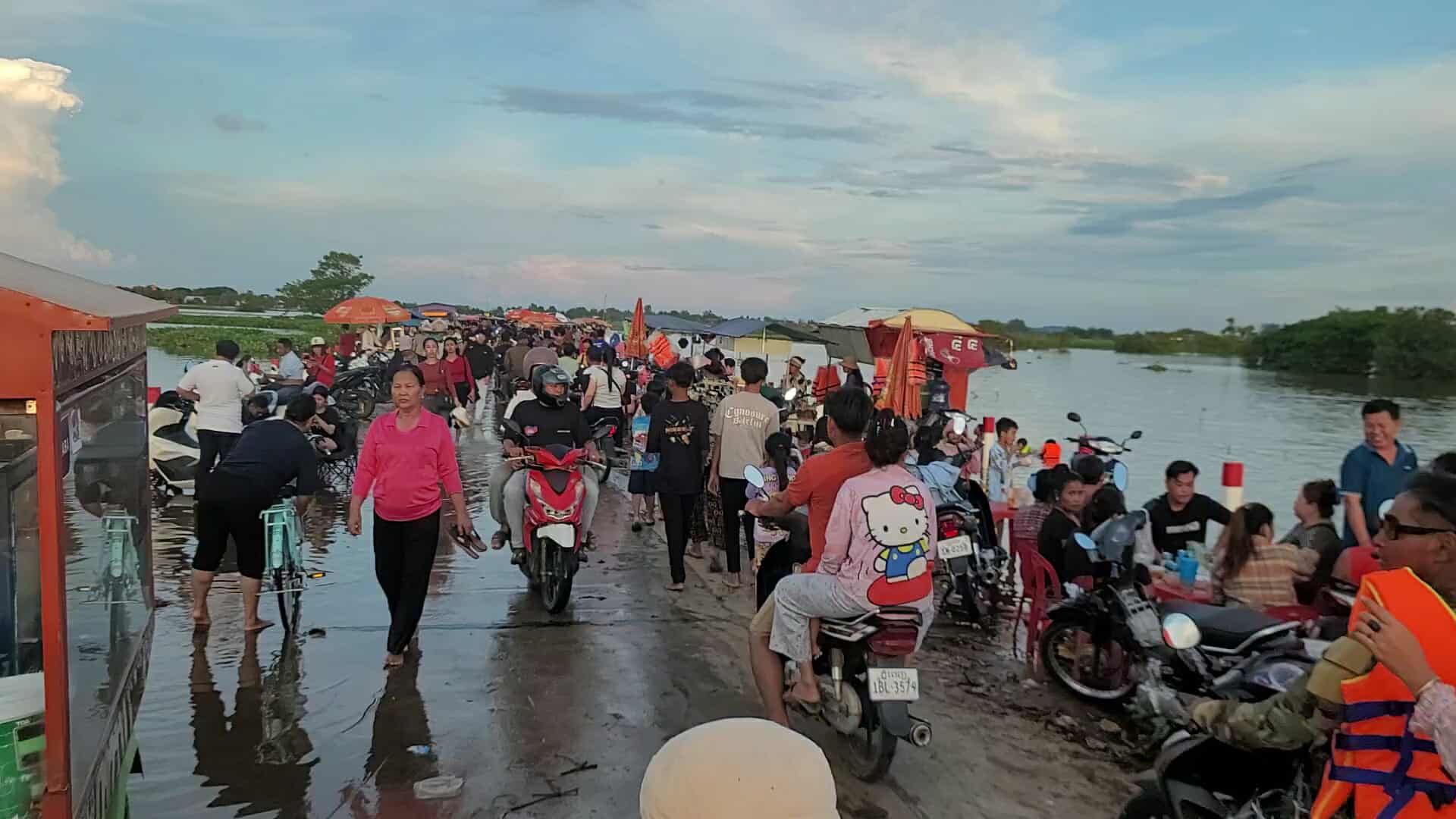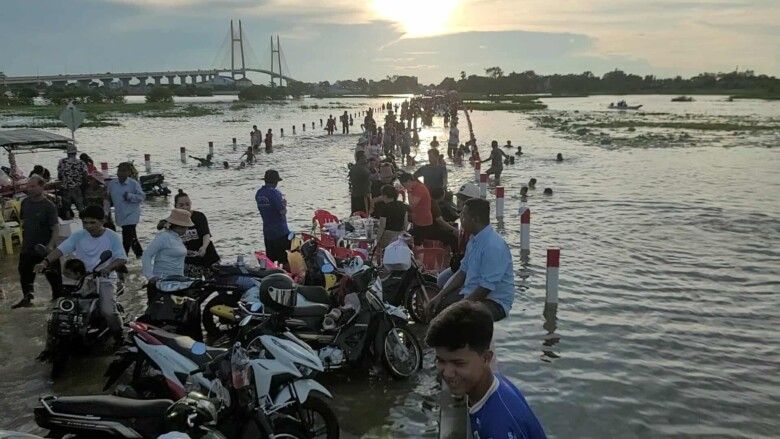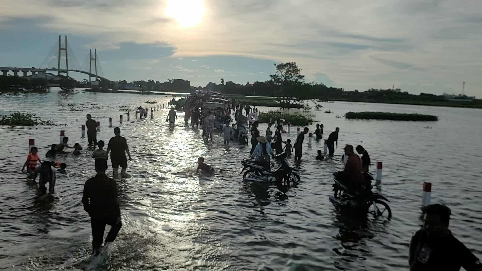【柬埔寨头条综合报道】据柬媒消息,柬埔寨波罗勉省边罗县Banlich Prasat乡Prek Cham村的一条长近2公里的水泥路,在被洪水淹没后,反而意外成为了当地的热门景点,吸引了数千民众前来游玩。 |
