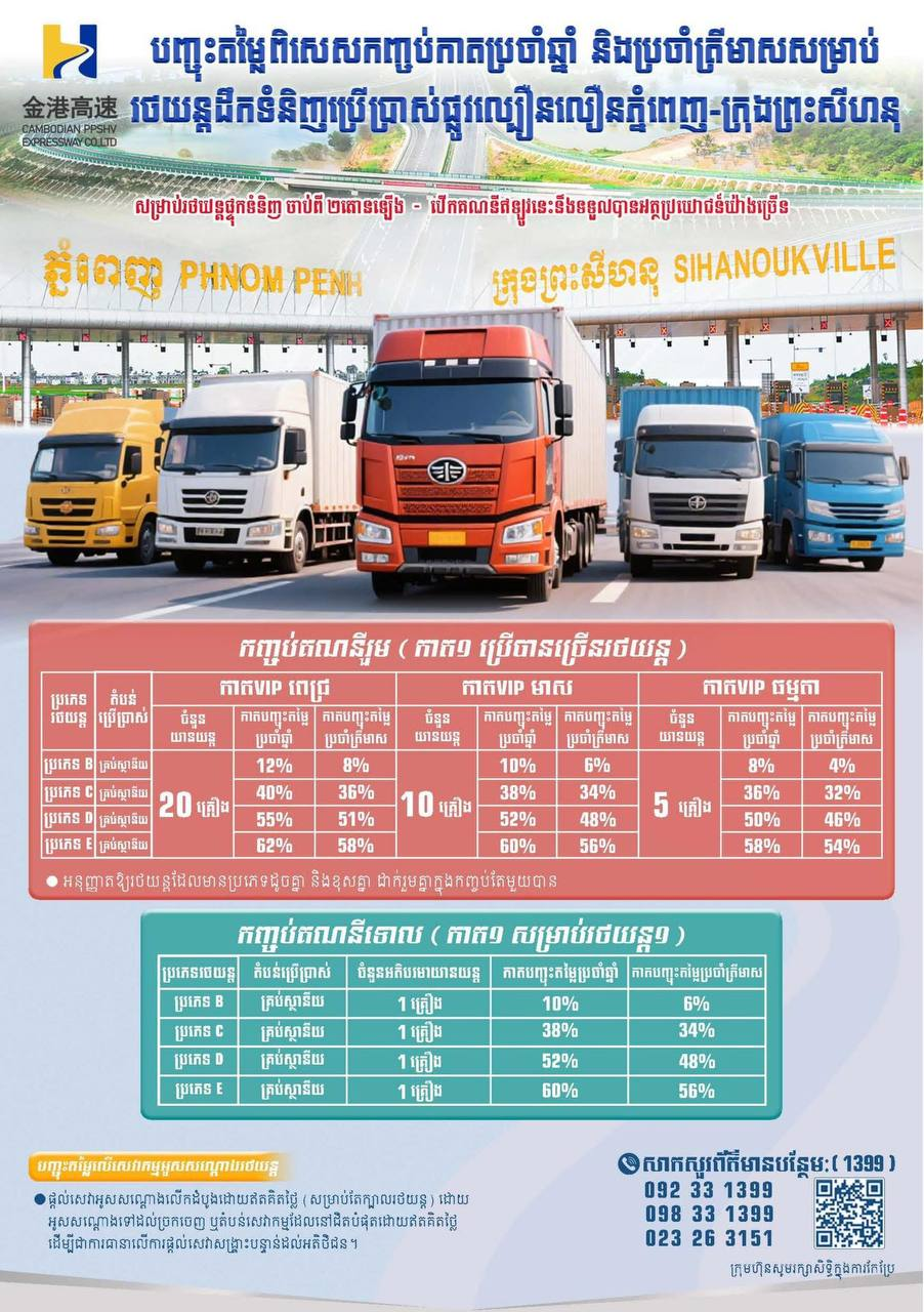 【柬埔寨头条综合报道】据柬媒消息,近日,金港高速公路公司正式推出货运车辆优惠套餐,包括年卡与季卡两种类型,为货运客户提供多项实用优惠,最高可节省达46美元/趟。 据介绍,本次推出的优惠卡套餐主要包括以下三种类型: 1. 联名账户套餐:一个账户可绑定多辆车辆,最高可享62%的通行费优惠,为目前史无前例的折扣力度。 2. 单账户套餐:一个账户仅限一辆车使用,最高可享60%的优惠。 3. 卡包客户专属福利:购买卡包的用户可享受免费ETC设备安装服务及拖车服务折扣。 金港高速公司表示,使用高速公路运输可有效降低运输成本、节省运输时间、提升行车安全,为企业货运及物流运输提供更高效便捷的选择。 如需了解更多优惠详情,请联系:023 263 169 / 023 263 162。 若需咨询其他信息或遇紧急情况,请联系:1399 / 098 33 1399 / 092 33 1399。 |