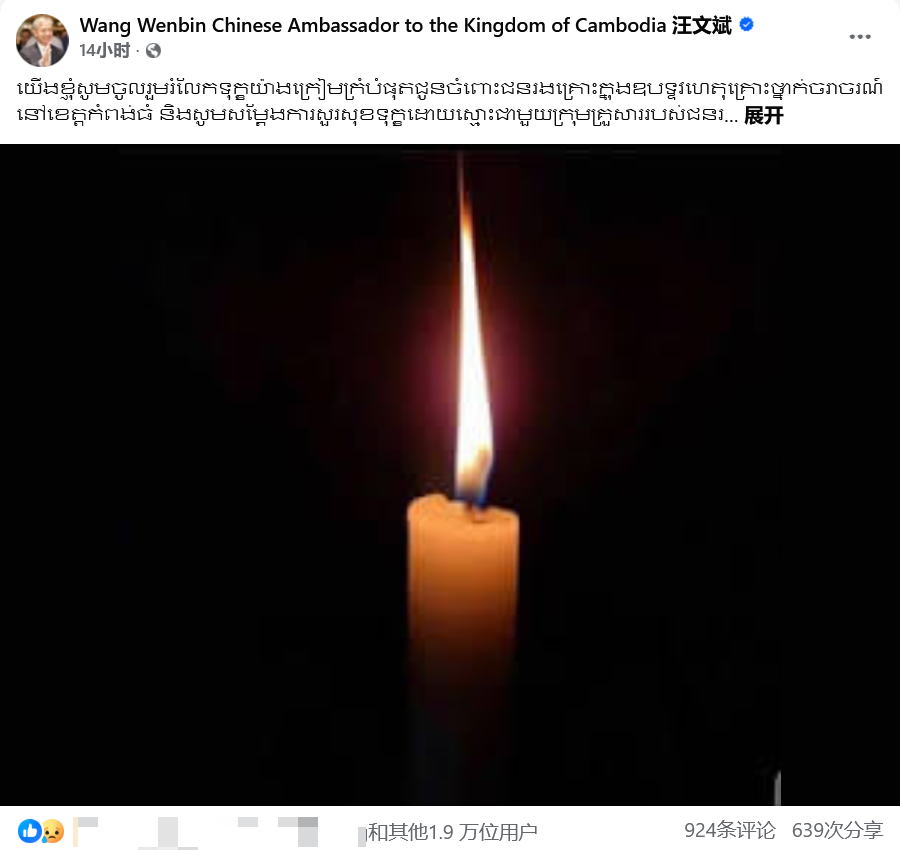 【柬埔寨头条综合报道】据柬媒消息,2025年11月20日晚,中国驻柬埔寨大使汪文斌在脸书上发文,向当日发生的磅通省交通事故遇难者表示沉痛哀悼,并向死难者家属及伤者致以最诚挚的慰问。大使在贴文中写道:“向磅通省 ...