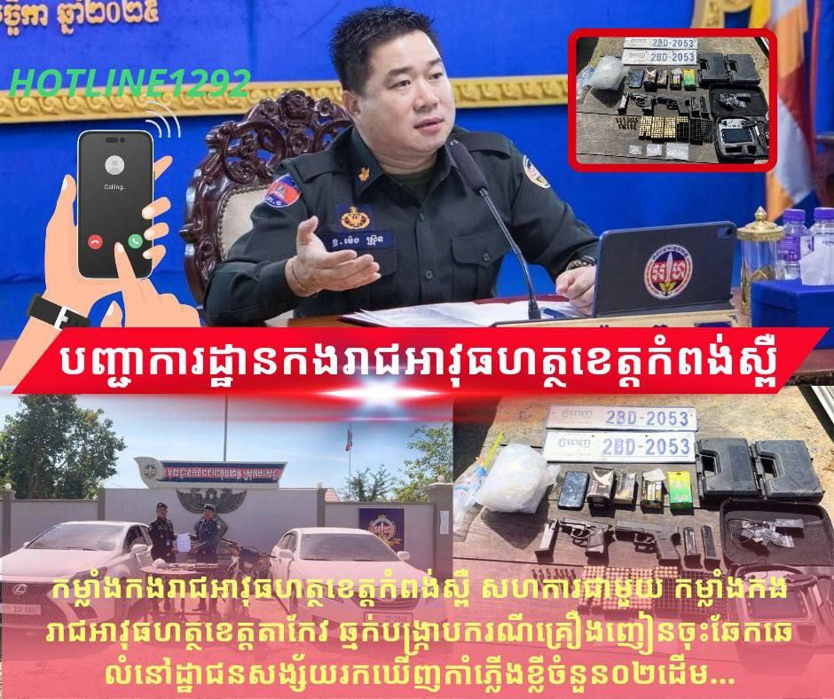 | 【柬埔寨头条综合报道】据柬媒消息,2025年11月29日上午6点50分,柬埔寨实居省宪兵部队联合茶胶省宪兵部队,在两地检察官的法律协调下,突袭打击了一起毒品案件,并对一名工厂女工的住所进行了搜查。此次联合行动是根据国家宪兵总司令邵速卡的指示展开。宪兵部队在实居省巴塞县搜查了23岁嫌疑人Sem Raksa的住所,并成功将其逮捕。 宪兵部队在现场查获的物证包括: 3大包疑似毒品的白色晶体粉末; 2把手枪、3个弹夹(共计181发子弹);其他物证: 2辆汽车、1辆摩托车、1部手机、以及部分吸毒工具。 目前,巴塞县宪兵已将嫌疑人及全部物证移交给茶胶省宪兵部队,以便依法进行后续处理。(编译:影子) |