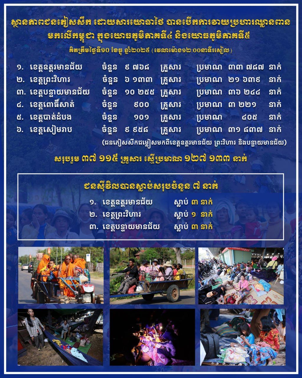 【柬埔寨头条综合报道】柬埔寨国防部发布的通告称,截至12月10日下午12时,因泰军袭击柬埔寨事件中,已造成柬埔寨7名平民丧生,流离失所难民增至37,115户家庭,总计127,133人。此外,该国防部证实7名平民死亡,包括 ...