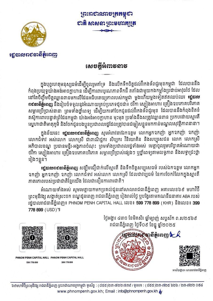 | 【柬埔寨头条综合报道】据柬媒消息,为支持正在英勇战斗、保卫领土完整的前线军队,以及援助撤离到安全中心的受影响民众,金边市政府正式公布捐款渠道,准备接收各类捐赠。 金边市政府呼吁各位大公爵、公爵、勋爵、企业家、慈善人士、政府单位以及广大民众,请根据各自的能力和慷慨之心,踊跃捐赠资金、粮食、生活用品以及各种物资及药品。 金边市政府强调,大家的慈善精神是高棉民族兄弟情谊中分享的文化,也是国防的基石。所有接收到的物资和资金将全部用于分发给前线军队和受影响民众。 民众可通过两种方式进行捐赠,物质可以直接送至金边市政府(地址:金边市隆边区沙拉佐分区莫尼旺大道69号大楼),每天均可接收。 或通过金边市政府ABA银行账户转账: •账户名称:PHNOM PENH CAPITAL HALL •瑞尔账户(KHR):599 778 899 •美元账户(USD):399 778 899。 (编译:影子) |
