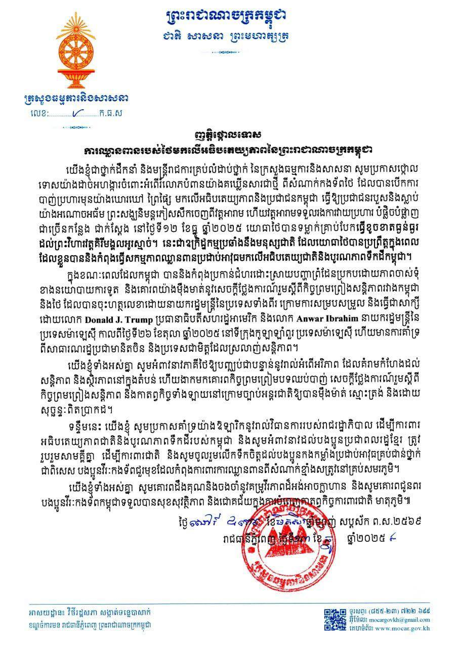 【柬埔寨头条综合报道】据柬埔寨媒体12月13日报道,柬埔寨宗教事务部发布声明称,12月12日,泰国军方投掷炸弹,导致奥多棉芷省基里蒙坤奥斯玛寺严重受损。 声明指出,泰军在柬埔寨领土的炮击造成多人伤亡,僧侣被迫撤离寺庙,寺内多处建筑遭到不同程度破坏。柬埔寨宗教事务部各级领导及全体公务人员对此表示最强烈的谴责,认为泰国军队再次以野蛮残暴的方式侵犯柬埔寨国家主权和人民安全。 宗教事务部表示,泰方在对柬埔寨国家主权和领土完整实施武装侵略过程中,对宗教场所发动袭击,其行为已构成严重违反国际法和人道原则的罪行,性质极其严重。 声明强调,柬埔寨敦促泰国立即停止一切威胁地区和平与稳定的敌对行动,并以坚定、诚实和真诚的态度,重新遵守停火协议、《和平协议联合声明》以及国际法所规定的全部义务。 与此同时,宗教事务部明确表示,坚定支持柬埔寨王国政府为维护国家主权和领土完整所采取的一切正当措施,并呼吁全体柬埔寨公民团结一致,携手保卫国家,共同鼓舞和支持各级武装部队,特别是奋战在各条战线、英勇抵抗侵略的前线官兵。 宗教事务部谨向所有英勇的柬埔寨战士致以最崇高的敬意,并将铭记他们为国家和人民作出的牺牲与奉献,衷心祝愿全体将士在捍卫祖国的征程中平安顺利,圆满完成使命,取得最终胜利。 |