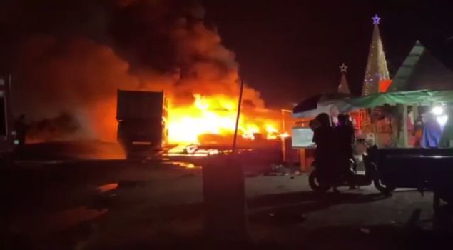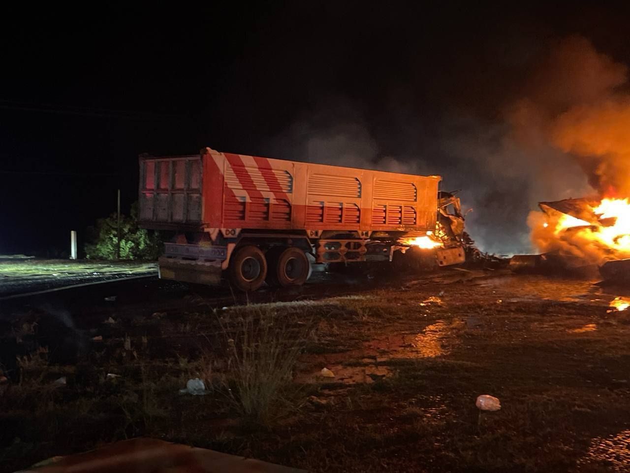 【柬埔寨头条综合报道】据柬媒消息,2025年12月14日凌晨5点20分,柴桢省斯外芝伦县1号公路发生一起交通事故。一辆运土车猛烈追尾一辆油罐车,导致油罐车瞬间起火,被烧得只剩骨架。目击者透露,事发前,一辆油罐车( ...