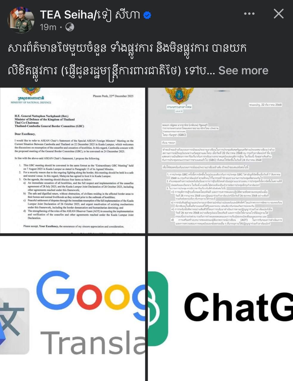 【柬埔寨头条综合报道】据柬媒报道,近日,柬埔寨副首相兼国防部长狄西哈就部分泰国官方及非官方媒体的相关报道表达不满,指出这些媒体将柬埔寨致泰国国防部长的官方信件当作“泄露文件”发布,并对信件内容作出与原意不符的解读。 狄西哈副首相通过官方社交媒体发文表示,一些泰国媒体不论官方或非官方性质,均将一封正式致函泰国国防部长的官方信件以泄密文件形式对外传播。他质疑称,在当今时代,翻译工具早已十分普及,不仅有谷歌翻译,还有ChatGPT、Gemini等多种技术手段可供使用,但相关媒体仍然对信件内容进行了错误翻译,并向泰国民众传播与原文含义不符的信息,导致公众无法真正理解信件的真实意思。 他最后无奈表示:“我已经困惑到无法再困惑了。” |