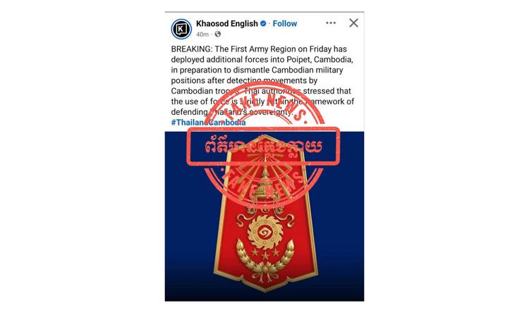 【柬埔寨头条综合报道】据本地媒体报道,近日泰国媒体报道柬埔寨已向卜迭棉芷省波贝地区调动军队,柬埔寨国防部发文驳斥了这一假新闻。 柬埔寨国防部特此驳斥泰国媒体刊载的虚假信息,此类报道纯属捏造、与事实完全不符。 由于波贝地区是卜迭棉芷省人口稠密的商业中心,且居住了包括多国外国人在内的众多民众,柬埔寨并未向该地区调动军队。(编译:Thomas) |
