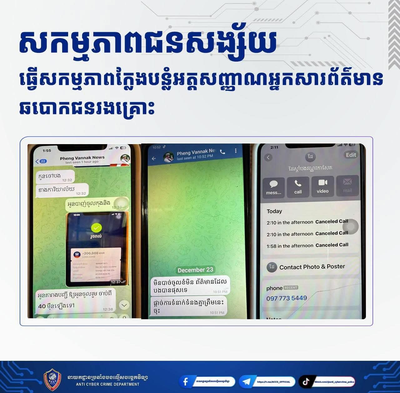 【柬埔寨头条综合报道】据柬埔寨媒体12月30日报道,柬埔寨反科技犯罪局发布通报称,一名男子冒充记者,利用通讯软件实施诈骗和勒索行为,已被警方成功抓获。通报指出,警方根据柬埔寨国家警察总署总监苏通的指示,并 ...