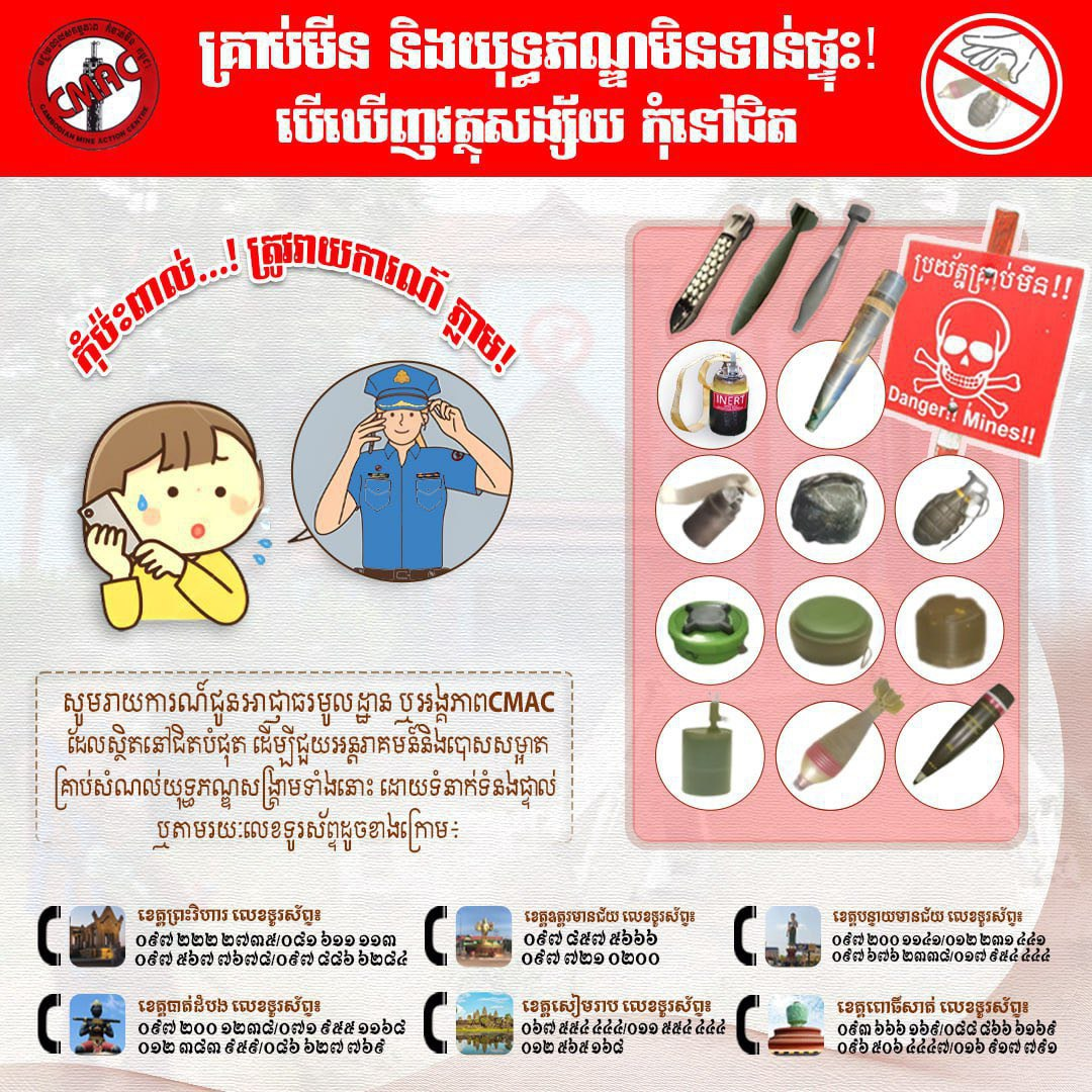 【柬埔寨头条综合报道】据柬媒报道,1月12日,柬埔寨排雷行动中心(CMAC)主任兴洛达那呼吁正在返回家园的民众和难民务必保持高度警惕,谨防泰军侵略战争遗留弹药带来的安全风险,尤其是集束炸弹。兴洛达那表示,CMA ...