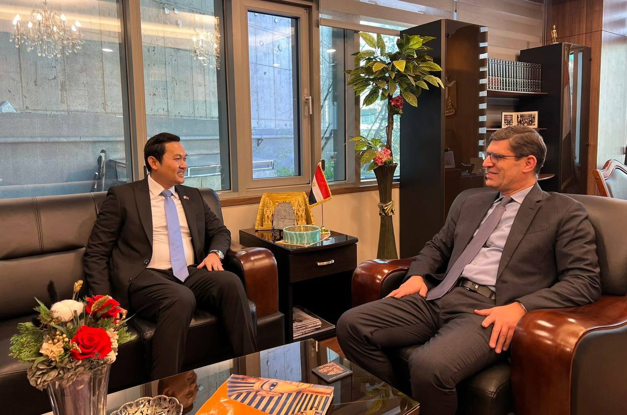 【柬埔寨头条综合报道】据柬媒报道,1月21日,柬埔寨驻韩国大使坤·蓬拉达那与埃及驻韩国大使Hazem Ismail Ibrahim Zaki在韩国举行会晤。 会谈中,双方围绕加强两国驻韩国使团之间的关系与合作展开讨论,旨在提升双方在共同关心领域的协作效率,并进一步深化相互支持。双方就相关议题交换了建设性和富有成效的意见。 柬方大使对埃及政府长期以来对柬埔寨人力资源发展的支持表示感谢,特别提到埃及每年向柬埔寨穆斯林学生提供奖学金,使其能够前往埃及Al-Azhar University大学深造,为柬埔寨培养专业人才。 此外,坤·蓬拉达那大使还向埃及方面介绍了当前柬泰边境的最新发展和变化情况,双方并就地区及国际热点问题交换了看法。 |
