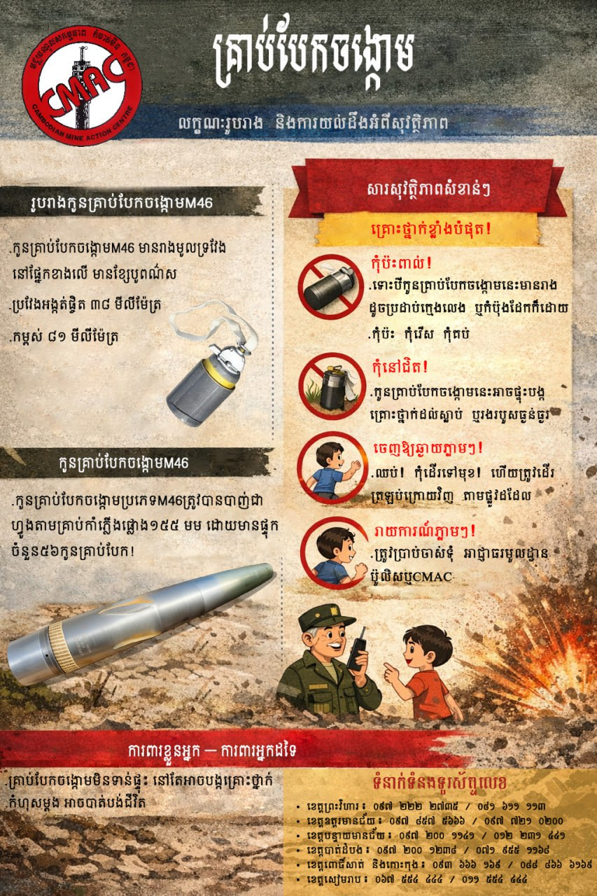 【柬埔寨头条综合报道】据柬媒消息,1月26日,柬埔寨排雷行动中心(CMAC)通过官方社交媒体平台发布紧急提醒,呼吁与泰国接壤各省的民众,对泰国军方在柬埔寨境内使用的 M46 集束炸弹子弹药保持高度警惕。CMAC指出, ...