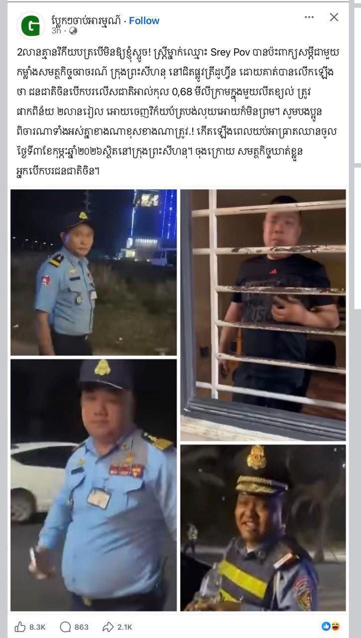 【柬埔寨头条综合报道】据柬媒消息,2026年2月3日,西哈努克省警察局发布官方声明,对社交媒体上流传的“中国男子酒驾被罚200万瑞尔且无收据”的虚假言论予以严正驳斥。 西港警方指出,为保障公共道路安全及社会治安,西哈努克省警察局陆路交通警察办公室在辖区内设立酒精监测点。然而,2026年2月2日夜间,执法人员在西哈努克市第三分区执行任务时,遭遇了一起干扰执法事件。 当晚,警方拦截了一辆悬挂金边车牌的黑色埃尔法汽车车。经检测,该名中国男驾驶员酒精含量高达0.68毫克/升。警方遂依法将其暂时留置,计划待其清醒后再由警方协助其安全返回。 在执法过程中,现场两名女性不仅拍摄视频干扰执法,还大声喧哗并试图强行带走涉事男子。两名女子现场辱骂、轻视执法人员,且言语逻辑混乱,疑似也处于醉酒状态。期间,二人试图向警方塞钱以求私了,但现场执法人员始终坚守原则,严词拒绝收受任何财物。 事后,网络上出现题为“200万瑞尔(约500美金)没收据,不给就拖车!”的贴文,指责警方在处理该起酒测值为0.68的案例时,收钱却拒绝开具收据。 对此,西哈努克省警察局严正澄清,所谓“索贿”或“无收据罚款”的内容纯属子虚乌有。目前,警方已正式邀请上述社交媒体账号所有者前往西哈努克省警察局说明情况,并要求其提供所谓“索贿”的实证,以正视听。(编译:影子) |