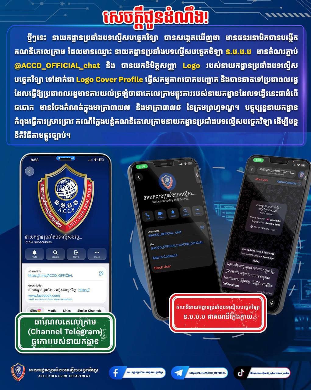 【柬埔寨头条综合报道】据柬媒消息,2026年2月13日上午,柬埔寨内政部反科技犯罪局发布通告,提醒广大民众严防一个冒充官方名义的Telegram诈骗账号。据悉,不法分子通过盗用反科技犯罪局的名称及标志(Logo)创建虚假账号,并以官方身份私聊市民。 警方强调,此类伪造公职机关身份行骗的行为已触犯《刑法》第377条和第378条。目前,该局正展开深入调查,将依法追究涉案人员的法律责任。 为厘清事实,反科技犯罪局郑重声明:该局从未设立过任何用于受理投诉或与民众直接沟通的 Telegram 个人账号。目前,该局仅运营一个官方 Telegram 频道,其唯一职能是发布科技发展动态、法律法规及分享防范网络诈骗知识,并不具备在线接警功能。(编译:影子) |