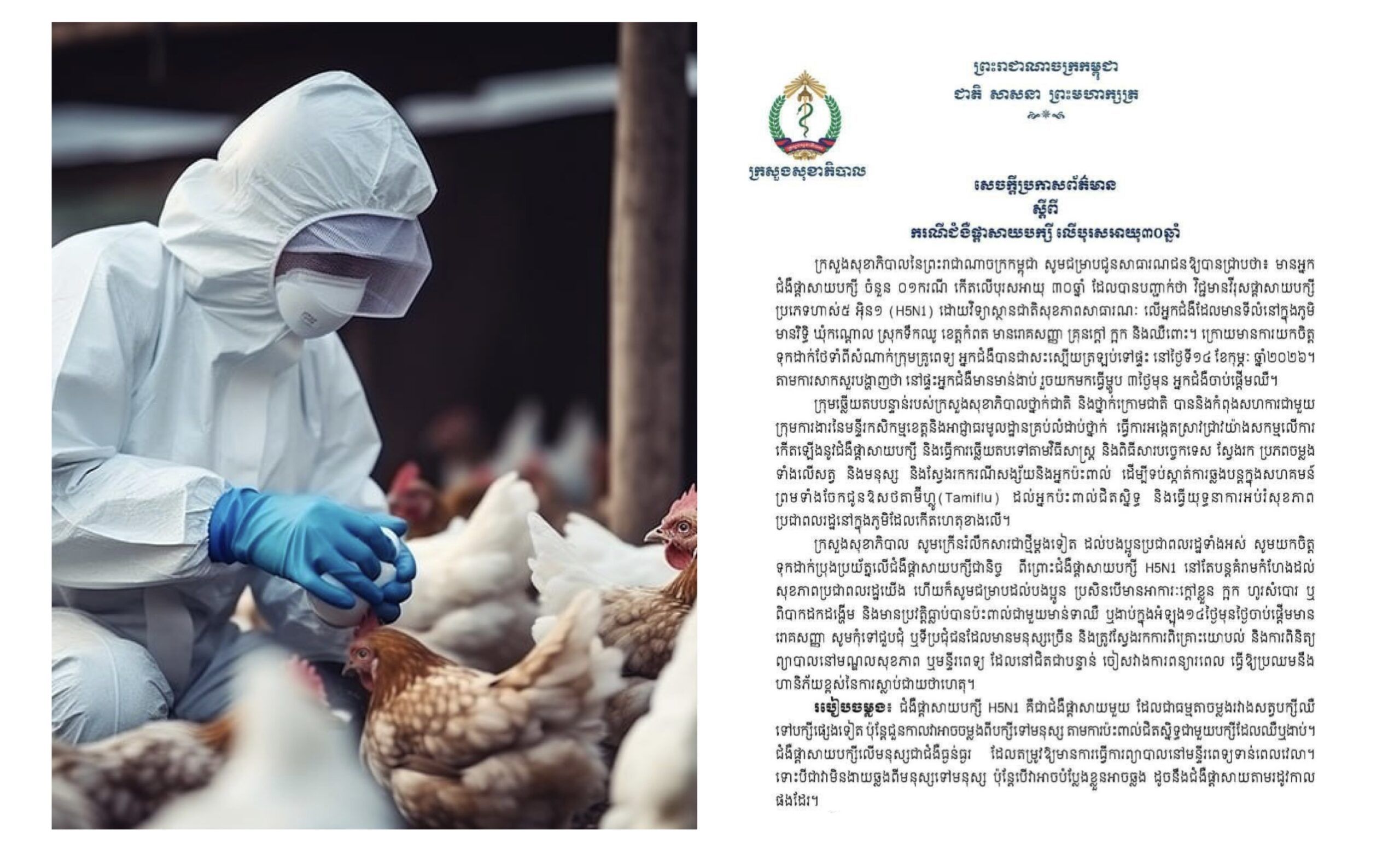【柬埔寨头条综合报道】据柬媒消息,柬埔寨卫生部2月14日通报,贡布省德楚县一名30岁男性先前确诊感染H5N1型禽流感。该患者此前出现发烧、咳嗽及腹痛等症状,经国家公共卫生研究所(NIPH)检测,结果呈阳性。 通报指出,在医护人员的治疗下,患者病情已好转,并于2026年2月14日痊愈回家。据调查得知,该男子在发病前三天曾接触并食用家中的死鸡。 事发后,卫生部国家及地方紧急响应小组联合农业部门和当地政府,在事发村庄展开流行病学调查,追踪病毒来源及潜在密切接触者,以防止病毒在社区扩散。目前,卫生部门已向密切接触者发放了抗病毒药物Tamiflu,并向当地村民开展卫生健康教育,指导民众防范禽流感。(编译:影子) |