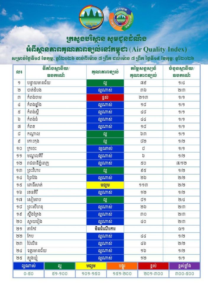 【柬埔寨头条综合报道】据柬埔寨环境部证实,从2026年2月18日上午7时至2月19日上午7时,柬埔寨空气质量保持"良好"水平。 据环境部消息,在此期间,空气中颗粒物平均浓度为每立方米26.95微克,远低于每立方米50微克的标准阈值。 环境部强调,基于这一水平,全国空气质量指数为"良好"水平。为在整个旱季保持良好空气质量,环境部呼吁广大民众及相关利益方积极参与预防和减少空气污染行动。 环境部指出,预防措施主要包括防止森林火灾、焚烧草地、焚烧农业废弃物、烧荒垦地、焚烧稻秆、露天焚烧垃圾、焚烧固体及塑料废弃物、焚烧纺织废料,以及管控垃圾填埋场火情。(编译:Thomas) |