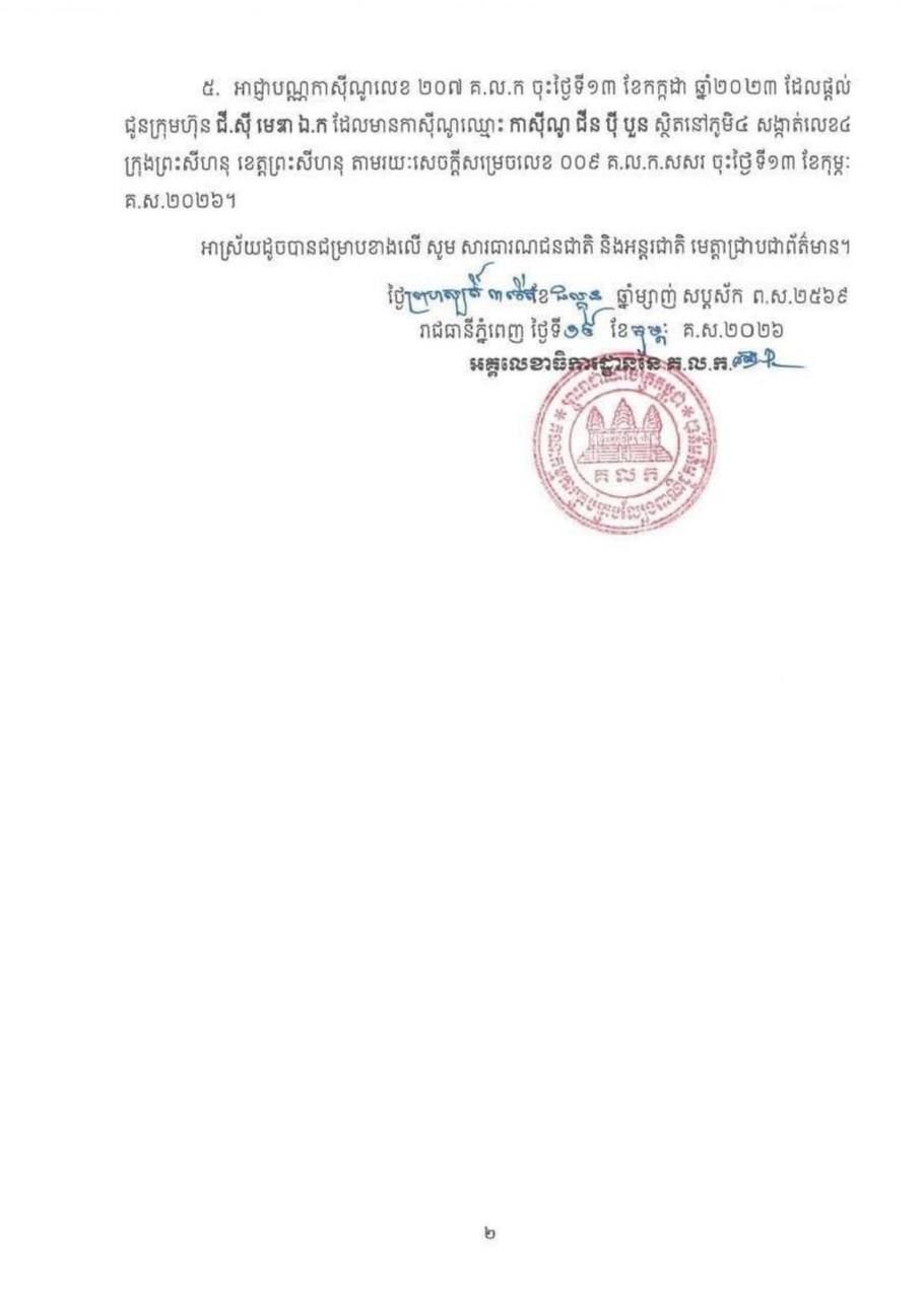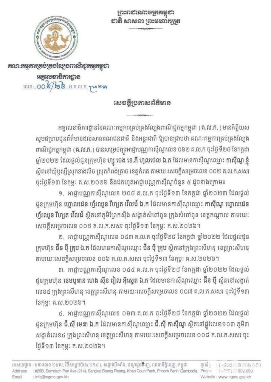 【柬埔寨头条综合报道】据柬媒报道,2月19日,柬埔寨商业博彩管理委员会(CGC)发布通告称,依据相关法律法规,对境内违规或不符合监管要求的博彩机构开展清理整顿,决定依法吊销5家赌场的营业执照,并对1家赌场作出 ...