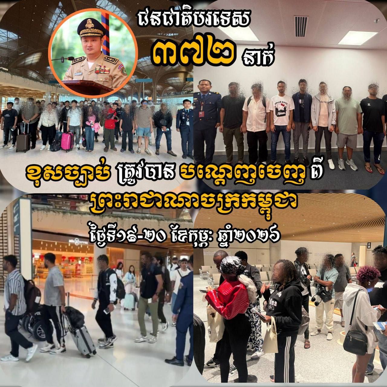 【柬埔寨头条综合报道】据柬媒消息,柬埔寨移民总局于2月21日通报称,依据副首相兼内政部长苏速卡及内政部领导的指示,移民总局局长于2月19日至20日下令调查与执法局依法驱逐372名外国人(其中女性54人),涉及18个国家和地区。 被驱逐人员分别来自中国、马来西亚、印度、斯里兰卡、孟加拉国、巴基斯坦、印度尼西亚、肯尼亚、尼日利亚、埃及、埃塞俄比亚、加纳、乌干达、菲律宾、巴西、挪威、南非及中国台湾,均通过德崇国际机场离境。 通报指出,上述人员涉嫌非法入境、未持有护照(非法留居)及在柬非法务工。 柬方表示,此次行动是政府持续打击网络诈骗的重要举措,旨在维护地区及国际社会安全。同时,执法行动也包括解救被诱骗参与网络诈骗的受害者,并协助其安全返回原籍国。 |