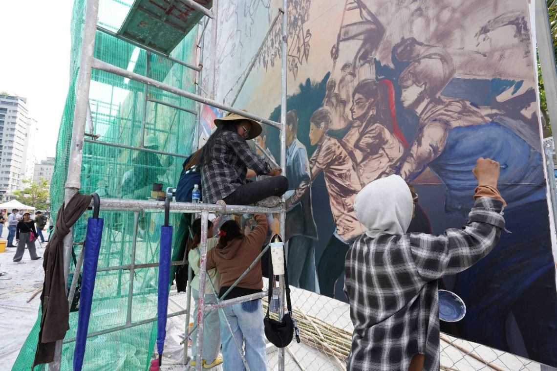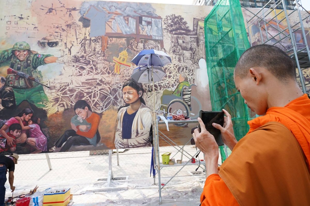 【柬埔寨头条综合报道】据柬媒近日消息,位于金边市隆边区波东寺前的“和平艺术壁画”已逐渐成形。该作品规模宏大,整体尺寸达5米×35米,面积超过此前在暹粒展出的同类壁画,并于2026年2月20日正式开始绘制。 创作团队介绍,壁画预计于3月初完工,并将持续展出至2026年5月3日,期间向公众开放参观。 据悉,这幅“和平艺术壁画”以历史事件为背景,通过艺术形式呈现泰国入侵战争给国家与人民带来的深重影响,反映柬埔寨平民在冲突中的苦难,以及部分基础设施和文化遗产遭受破坏的历史记忆,旨在传递珍视和平、铭记历史的主题。 |