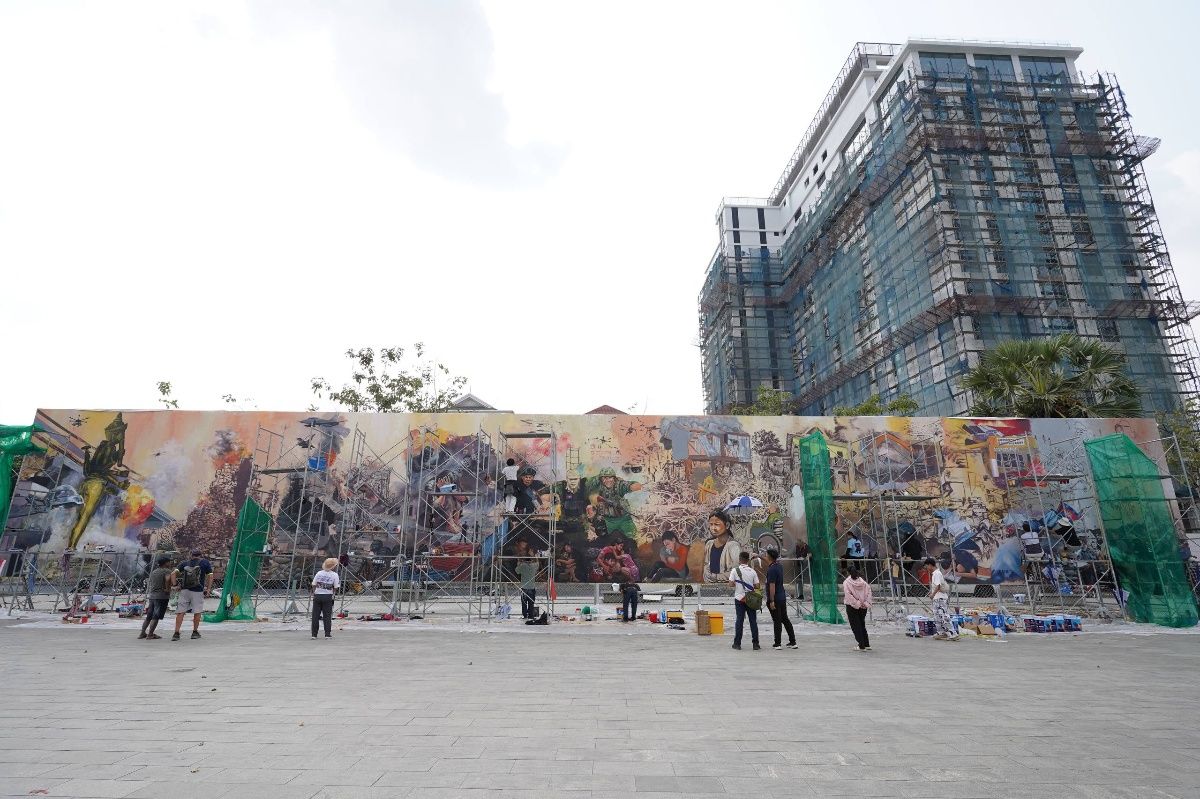 【柬埔寨头条综合报道】据柬媒近日消息,位于金边市隆边区波东寺前的“和平艺术壁画”已逐渐成形。该作品规模宏大,整体尺寸达5米×35米,面积超过此前在暹粒展出的同类壁画,并于2026年2月20日正式开始绘制。创作团 ...
