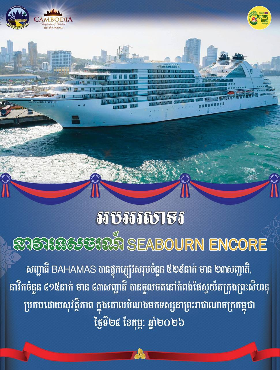 【柬埔寨头条综合报道】据柬媒消息,2026年2月24日,柬埔寨旅游部迎来一艘巴哈马籍邮轮“SEABOURN ENCORE”停靠西港。该邮轮载有23个国籍的529名游客,以及43个国籍的415名船员。在旅游部长胡海的指导下,邮轮顺利、 ...