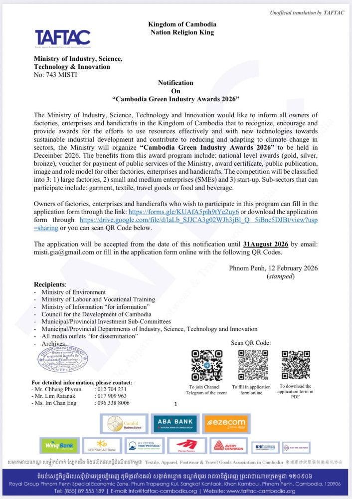 【柬埔寨头条综合报道】据柬埔寨工业科技和创新部近日发布通告,宣布将于2026年12月举办"2026年柬埔寨绿色工业奖"评选活动。 据通告显示,该奖项旨在表彰、鼓励那些致力于通过资源高效利用和新技术应用来支持可持续工业发展,同时为减缓和适应气候变化做出贡献的工厂、企业和手工作坊。 该奖项计划提供多项福利,包括国家级奖项(金奖、银奖和铜奖)、该部公共服务缴费代金券、获奖证书,并作为其他工厂、企业和手工作坊的榜样。 评选分为三个类别: 1.大型工厂 2.中小型企业 3.初创企业 符合条件的行业包括服装、纺织、箱包以及食品饮料。 有意参与的工厂、企业和手工作坊业主可自通告发布之日起至2026年8月31日期间提交申请。申请可通过提供的链接在线完成、从该部官方平台下载表格、通过电子邮件发送至misti.gia@gmail.com,或通过通告中的二维码提交。(编译:Thomas) |