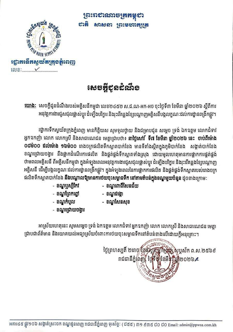 【柬埔寨头条综合报道】据柬媒消息,金边供水局发布通告称,由于水净华区巴肯水处理厂暂停生产,金边市7个区于3月7日8时至16时期间,可能出现供水不足的情况。 通告指出,柬埔寨电力局(EDC)为配合道路扩建项目,正在对相关电力线路进行维修、安装及迁移,因此决定暂时停止向巴肯水处理厂供电,导致该水处理厂在此期间全面暂停清洁水的生产与供应。 受此影响,雷西胶区、仙市区、贡武区、水净华区、波森芷区、朗哥区及森速区的水压可能下降,个别区域或出现供水短缺。 金边供水局对此给公众带来的不便表示理解,并恳请市民予以谅解。 |
