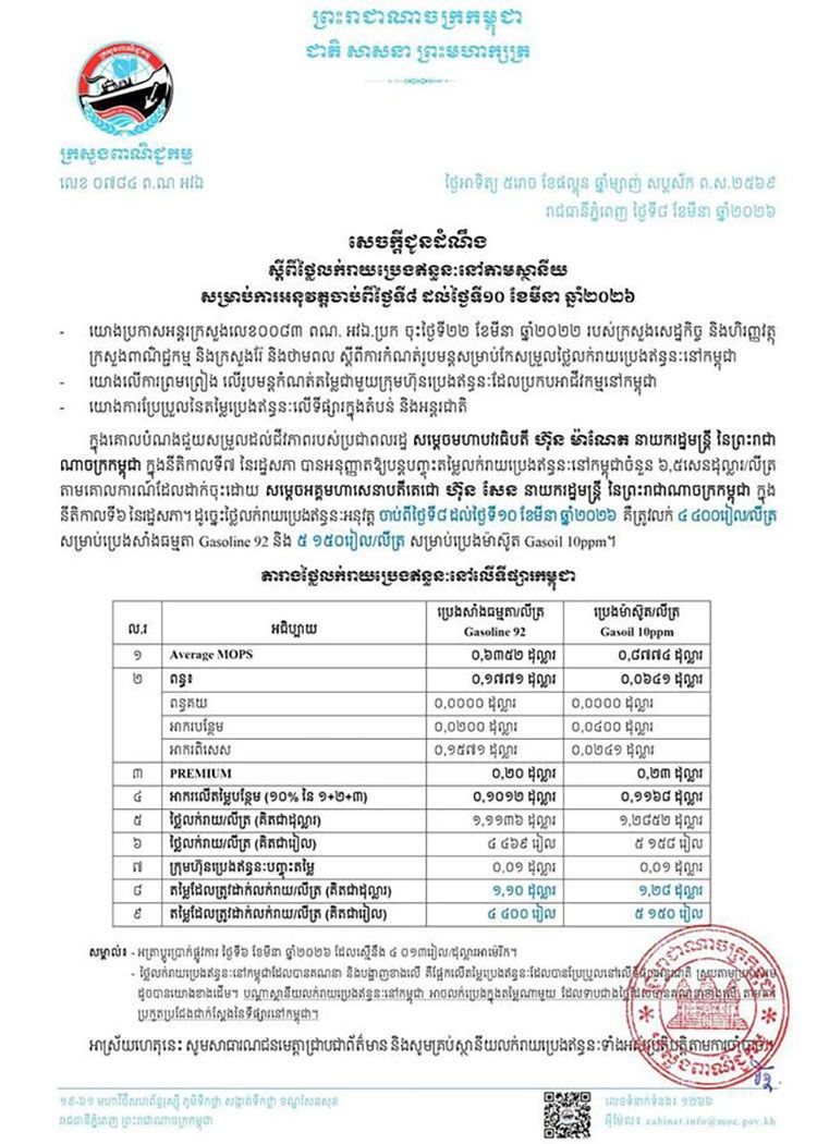 【柬埔寨头条综合报道】柬埔寨商业部3月8日下午发布的通告,自3月8日起至10日调整全国加油站燃油零售价格。此次调价依据是与燃油企业商定的定价,并反映区域与国际石油市场波动。为减轻民众经济负担,首相洪玛奈授权 ...