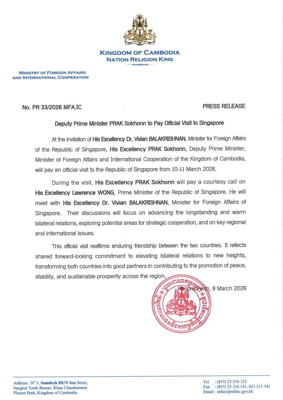 【柬埔寨头条综合报道】据本地媒体报道,应新加坡外交部长维文•巴拉科瑞斯南的邀请,柬埔寨副首相兼外交部长巴速坤将于2026年3月10日至11日对新加坡进行正式访问。访问期间,副首相巴速坤将拜会新加坡总理黄循财, ...