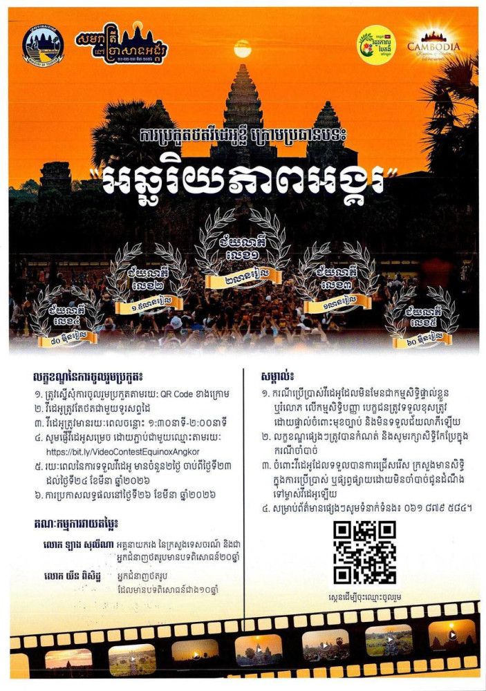 【柬埔寨头条综合报道】柬埔寨旅游部举办手机视频大赛, 推广"吴哥塔尖日出奇迹"活动。 柬埔寨旅游部宣布将举办一场使用手机拍摄的视频比赛,旨在推广以"吴哥塔尖日出奇迹"为主题的活动。 吴哥塔尖日出是一种自然现象,指的是太阳从吴哥窟中央圣殿正上方升起的时刻,由此形成的视觉奇观引人入胜,展现了古代高棉文明的科学知识和信仰。该活动每年都吸引大量国内外游客前来观赏。 这一自然现象每年发生两次:分别在3月21日至23日的春分期间和9月21日至23日的秋分期间。 为了进一步推广这一独特活动,旅游部诚邀游客和公众参与使用手机拍摄吴哥塔尖日出美景的视频比赛。 参赛者需通过二维码进行注册,并提交时长为1分30秒至2分钟的自行拍摄的视频。比赛将于2026年3月21日至22日举行,视频必须在2026年3月23日至24日期间通过此链接提交:https://bit.ly/VideoEquinoxAngkorContest。 评选结果将于2026年3月26日公布。将评选出五名优胜者,奖金分别为:第一名200万瑞尔(约合500美元),第二名150万瑞尔(约合375美元),第三名100万瑞尔(约合250美元),第四名80万瑞尔(约合200美元),第五名60万瑞尔(约合150美元)。(编译:Thomas) |