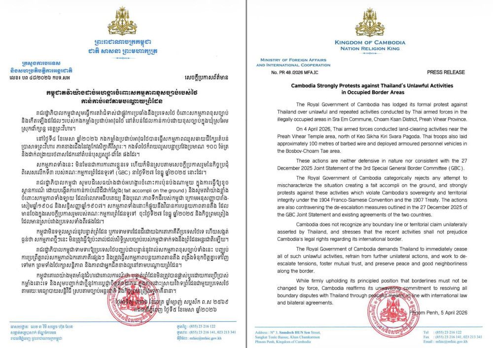 【柬埔寨头条综合报道】据本地媒体报道,柬埔寨政府针对泰国武装部队在柏威夏省边境地区屡次进行的非法活动,已向泰方提出强烈抗议。 据柬埔寨外交部4月5日下午发布的通告,这些事件发生于4月4日,地点在崇山县斯艾姆村,靠近柏威夏寺区域。 柬埔寨当局报告称,泰国军队在Keo Sikha Kiri Svara佛塔以北进行了土地清理作业,铺设了约100米长的铁丝网,并在Bosbov-Choam Tae地区部署了装甲运兵车。 柬埔寨政府表示,这些行动既不具有防御性质,也不符合2025年12月27日举行的第三届柬泰总边界委员会特别会议联合声明的精神。 柬埔寨断然拒绝其所谓的泰方企图在地面上制造“既成事实”的行为,并强调此类活动违反了1904年《法暹公约》和1907年《条约》所规定的柬埔寨主权和领土完整,也违反了现有双边协议。 通告重申,柬埔寨不承认任何由泰国单方面主张的边界线或领土要求,并强调近期的事态发展不会影响柬埔寨在国际边界问题上拥有的合法权利。 柬埔寨政府呼吁泰方立即停止所有此类活动,避免进一步的单边行动,并致力于缓和紧张局势、增进互信,维护边境地区的和平与睦邻友好。 柬埔寨重申其坚定承诺,将根据国际法和双边协议,通过和平手段解决与泰国的所有边界问题,同时坚持其原则立场,即不得以武力改变边界。(编译:Thomas) |