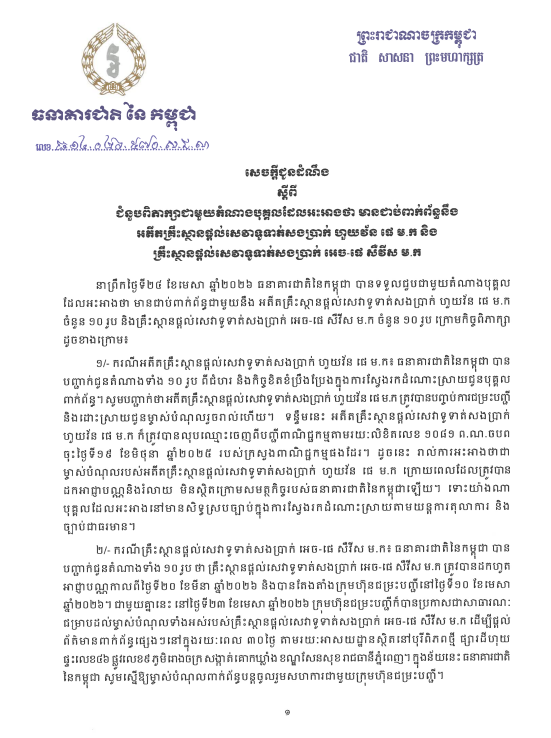 【柬埔寨头条综合报道】据柬埔寨国家银行 2026年4月24日发布的通告,柬埔寨国家银行接待了10名个人代表,他们自称与已注销的支付结算服务机构“汇旺”以及H-Pay支付服务机构。讨论结果如下: 1) 关于“汇旺支付”: 柬埔寨国家银行向全部10名代表说明了自身的立场,以及为受影响个人寻求解决方案所做的努力。国家银行确认,“汇旺支付”机构已完成清算,并已完成对债权人的清偿。此外,该机构名称已于2025年6月19日签发的第1081号信函从商业登记簿中注销。 因此,在原“汇旺支付”的执照被吊销且机构解散后,任何声称是该机构债权人的主张均不再属于柬埔寨国家银行的管辖范围。不过,提出此类主张的个人仍然享有通过司法机制和适用法律寻求解决方案的合法权利。 2) 关于支付服务机构“H-Pay”: 柬埔寨国家银行向全部10名代表说明,“H-Pay”的执照已于2026年3月20日被吊销,并于2026年4月10日任命了清算公司。 2026年4月23日,清算公司公开发布通知,要求“H-Pay”的所有债权人在30天内提供相关信息,联系地址如下:金边市森速区9号路新世界房建小区。 就此,柬埔寨国家银行呼吁相关债权人继续配合清算公司的工作。 国家银行指出,尽管会谈已结束且发布相关信息,仍有约200名相关人员在国家银行前聚集,并引起广大民众关注。对此,国家银行呼吁相关方寻求通过合法方式和平解决问题。(编译:Thomas) |