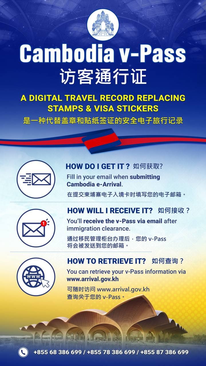 【柬埔寨头条综合报道】据本地媒体报道,为参与落实柬埔寨政府第七届政府关于发展数字经济社会的政策及五角战略第一阶段,移民总局继续推广试用 "v-Pass" (访客通行证) 系统,以取代所有通过三大国际机场及国际港口口岸出入境柬埔寨的外国旅客使用的传统移民印章或贴纸式二维码。 根据本地媒体4月27日上午收到的通告,移民总局明确指出,外国旅客可通过以下方式获取自己的柬埔寨 "v-Pass" 信息: • 通过电子邮件接收 • 通过柬埔寨电子入境官方网站 (https://arrival.gov.kh) • 通过柬埔寨电子入境的手机应用程序。(编译:Thomas) |