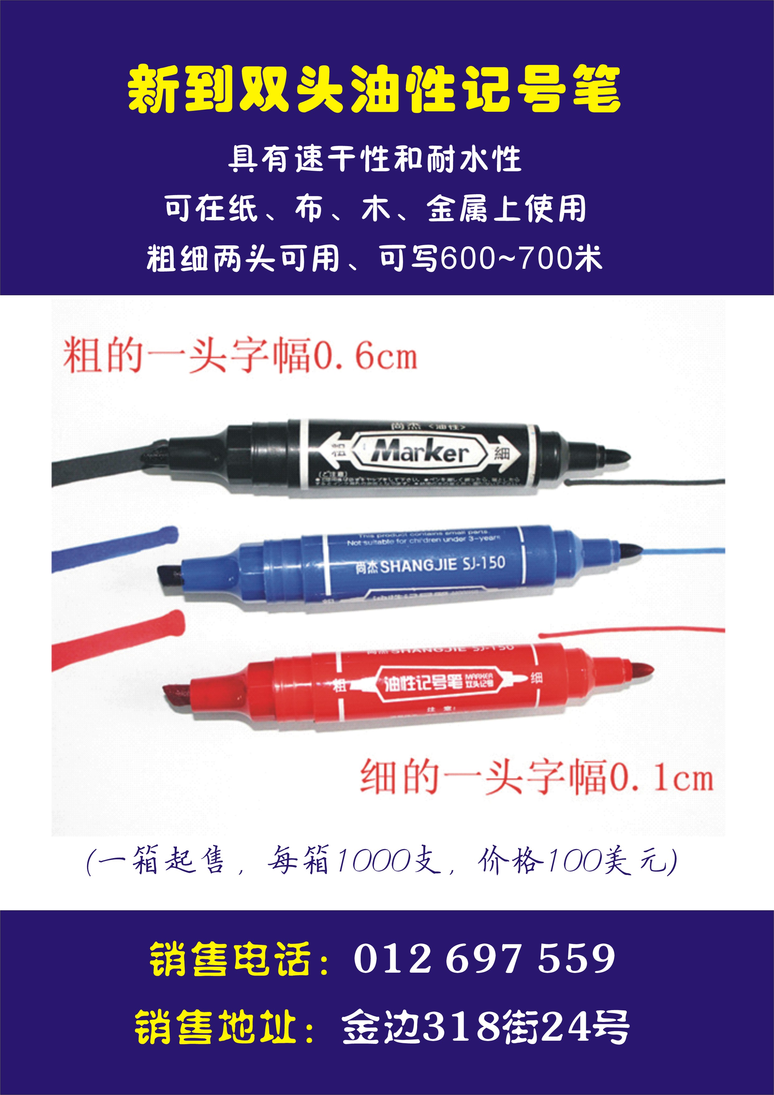 新到双头油性记号笔,数量有限、如购从速!电话:012 697 559。 1、型号:SJ-150-A6-BK。 2、颜色:黑、蓝、红。3、字幅:粗6mm,细1mm。 4、包装:10支/盒,5盒重一公斤。 ...