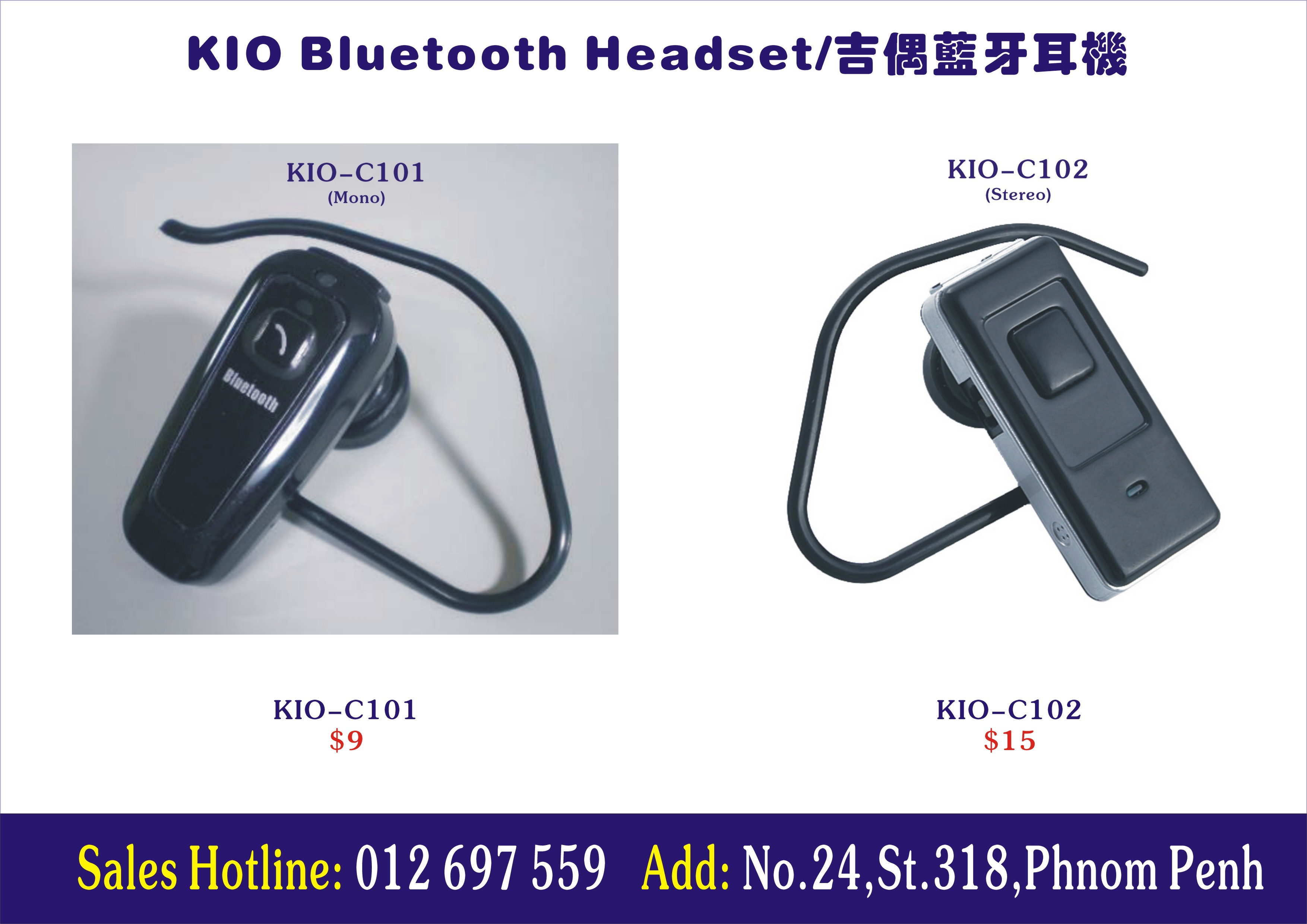 现有吉偶蓝牙耳机销售,KIO-C101为单声道蓝牙耳机,只能用于接听电话;KIO-C102位立体声蓝牙耳机,既可接听电话也可聆听音乐。 销售电话:012697559 销售地址:金边318街 ...