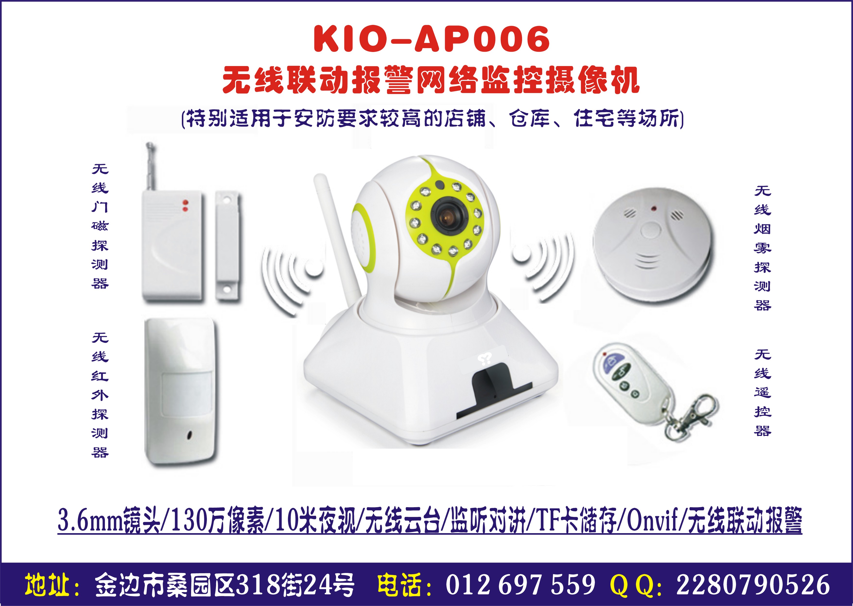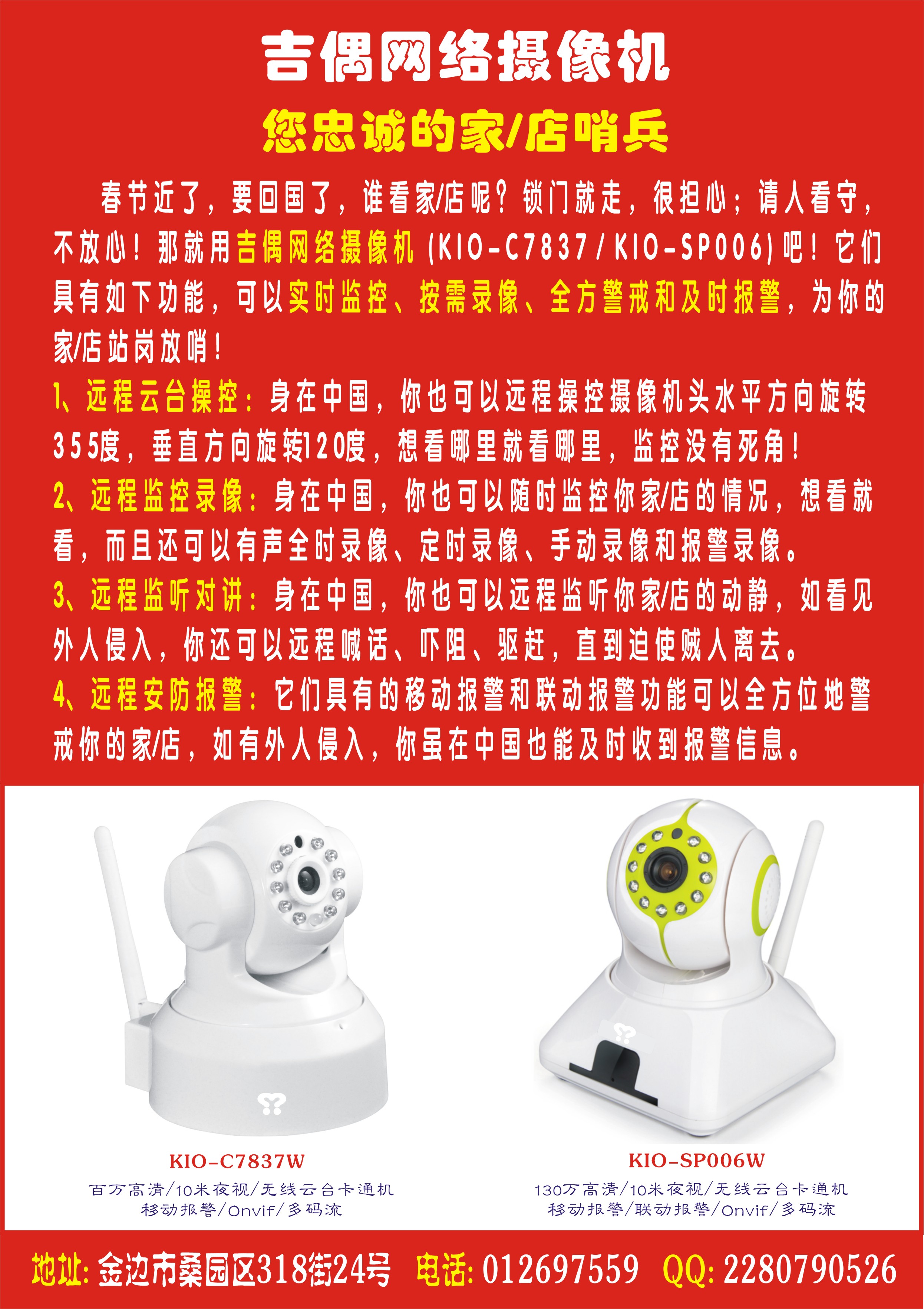 吉偶网络摄像机KIO-C7837和KIO-SP006您忠诚的家/店哨兵 地址:金边市桑园区318街24号电话:012 697 559