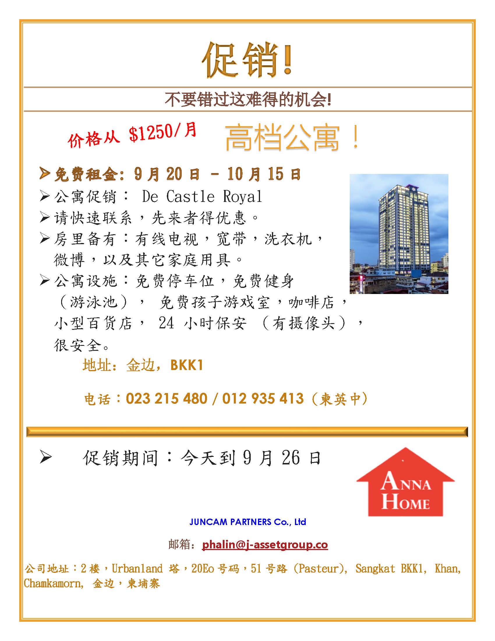 DE CASTLE ROYAL 是一家有名的公寓,位于金边市中心,周围是各种的商店和国际学校。里边具有多种的设施,让您过着方便的日子。站在楼顶让您看到金边的一切,特别是晚上的美景,享受清新的空气! 高端公寓,最完美的 ...
