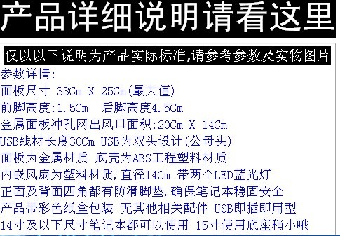 本帖最后由 wen882055 于 2011-5-11 23:18 编辑 NEW COOLer笔记本速效降温散热底座 蓝灯大风扇金属面板。(产品已到金边,批发接受预订/电联077571332) 店主辛苦在淘宝网淘来的价廉物美之产品,零售价USD14.00/个 ...