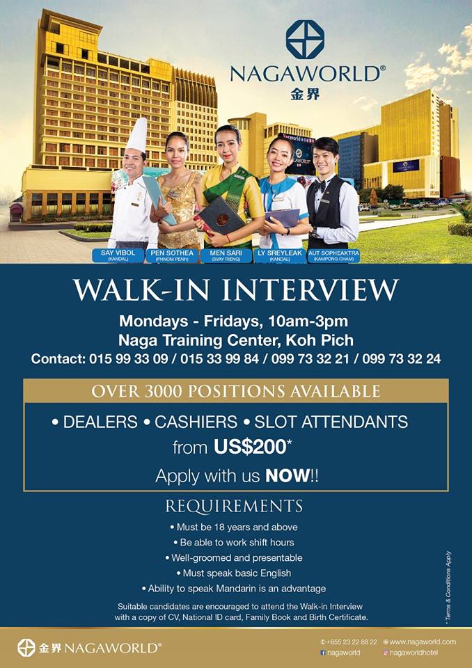 柬埔寨金边市金界城面试现在为了答复新的人力资源,所以面试条件改为自由面试! 联系电话:015 99 33 09/ 015 33 99 84 / 099 73 32 21/ 099 73 32 24 条件: 要求年龄在18岁以上 要求熟悉使用英语 其他条件请看 ...