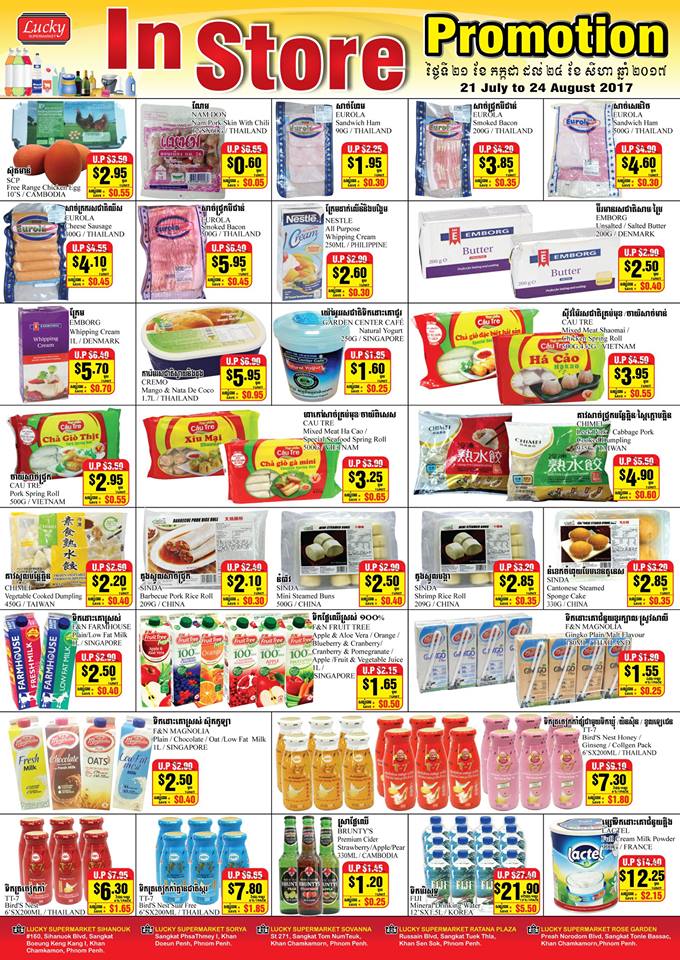 Lucky超市现有多种商品打折优惠 想购买日用品或食物请到这里的超市绝对划算,快来哦,时间有限哦。 优惠时间:现在起至8月24日。 地址:金边市 苏利亚超市、金满城超市、大都会超市。 ...