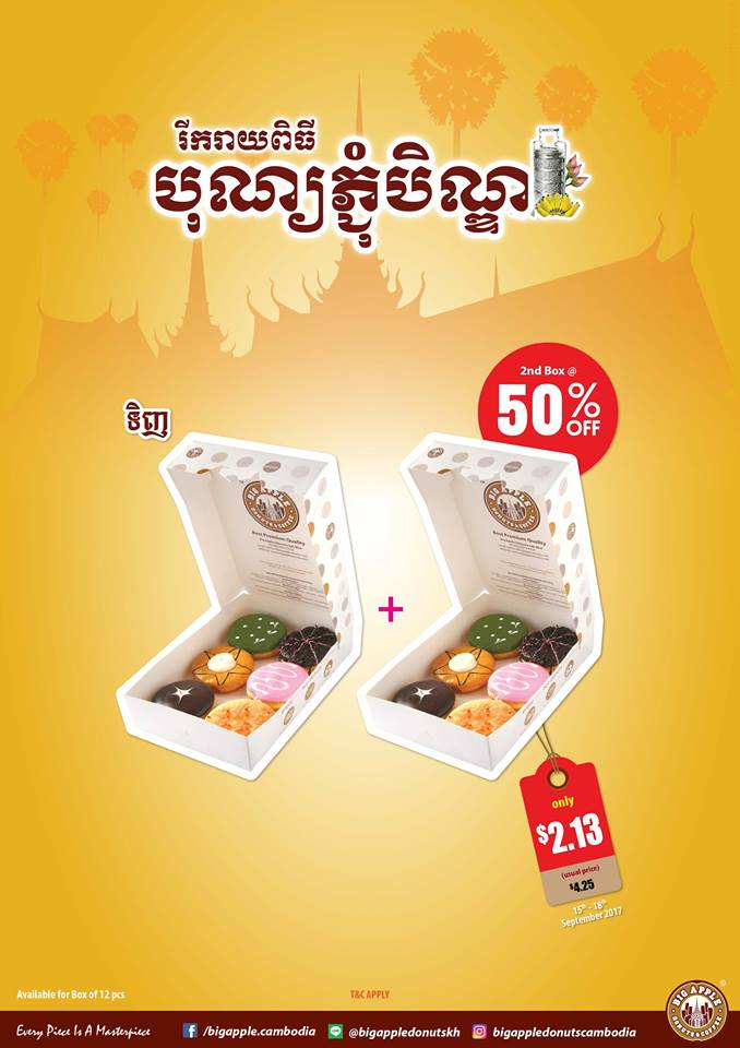 Big Apple Donuts & Coffee甜甜圈店亡人节打折优惠优惠时间:9月15至18日 地址:金边市 干隆街分店,堆谷区598路分店 联系电话:023 211 118