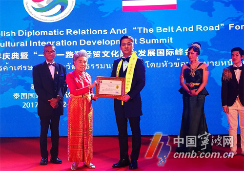 颁奖现场 中国宁波网讯(记者单玉紫枫)“这不仅是对我个人的肯定,更是泰国向甬商群体,以及广阔的宁波市场,伸出的‘橄榄枝’。”11月23日至26日,泰国曼谷国家行政会议中心举行“一带一路“经贸文化融合发展 ...