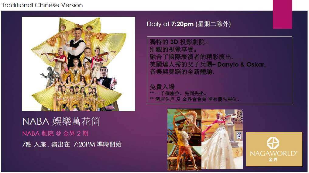 让你的休闲时间不再无聊?想要来金边最大最豪华的剧院欣赏一场视听盛宴吗? 我们诚邀您前来金界观看免费柬埔寨传统NABA歌舞表演,3月2号起每晚7:20开始,邀请您和您的家人一起来金界酒店(NagaWorld Hotel)欣赏这 ...