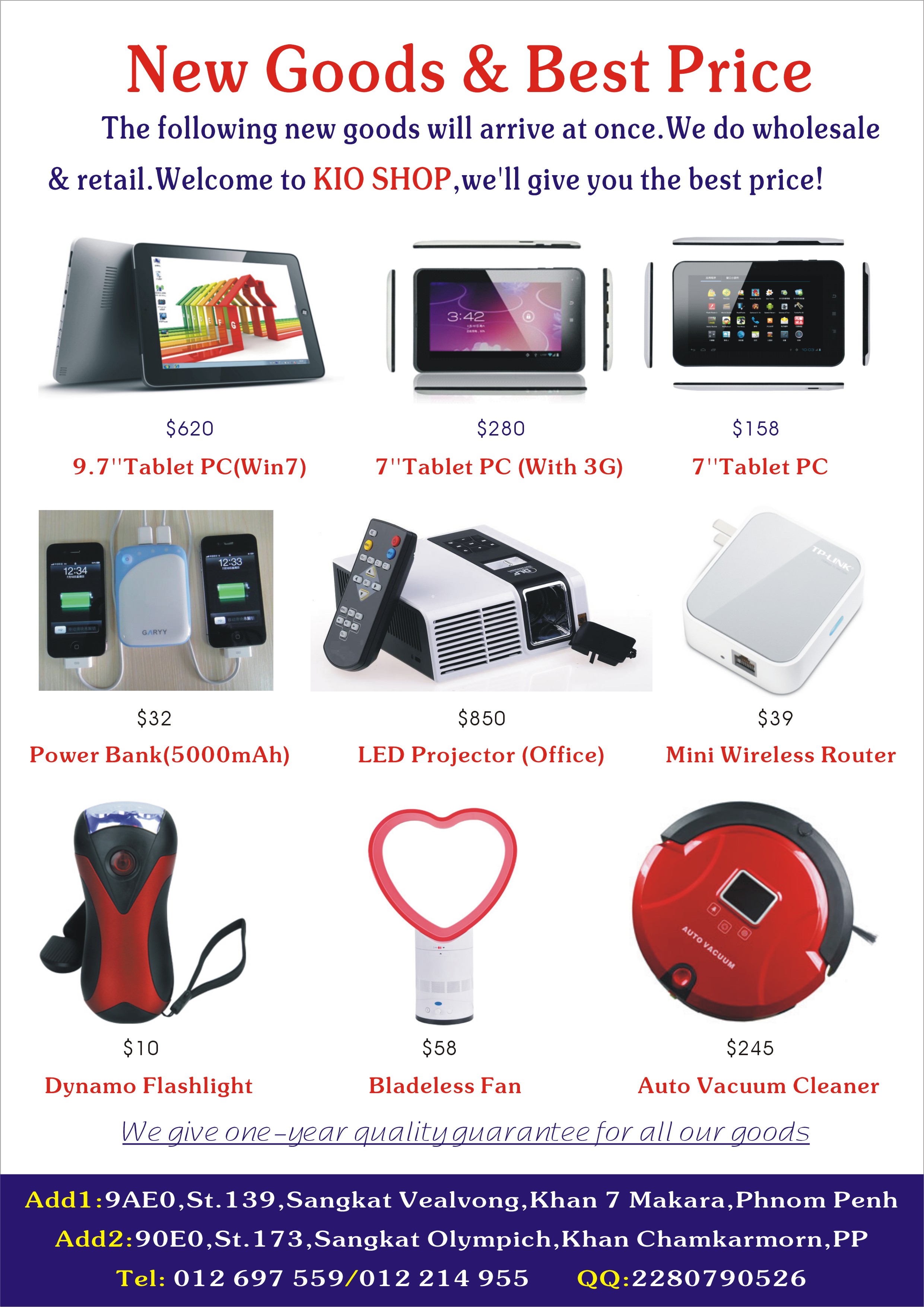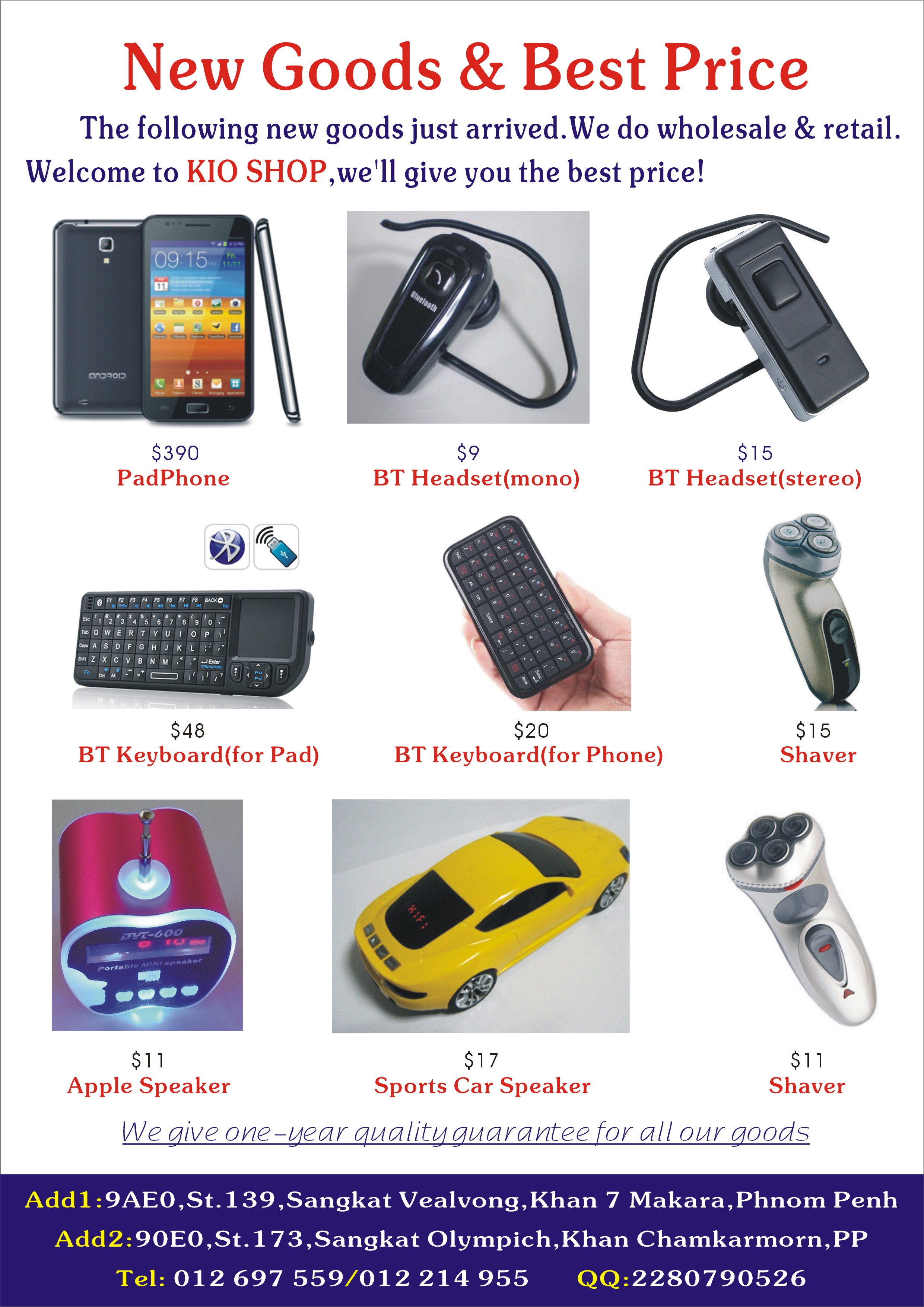 本店已搬迁至金边市139路门牌9A E0号(水仙花大酒店斜对面),新到平板电脑、平板手机、蓝牙耳机、蓝牙键盘、数码音响、电动剃须刀、迷你无线路由器等商品,欢迎大家来新店选购,优惠多多,数量有限,如购从速!抢购 ...