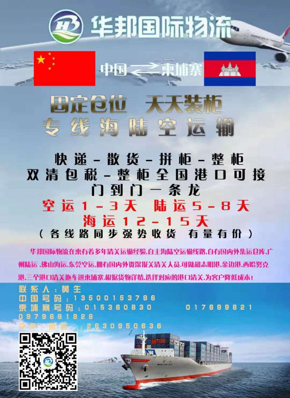 华邦国际物流在柬有着多年清关运输经验 自主海陆空运输线路 自有国内外集运仓库 广州陆运 佛山海运 东莞空运 拥有国内外资深报关清关人员 可做胡志明港 金边港 西哈努克港三个港口清关拖车进柬埔寨 根据 ...