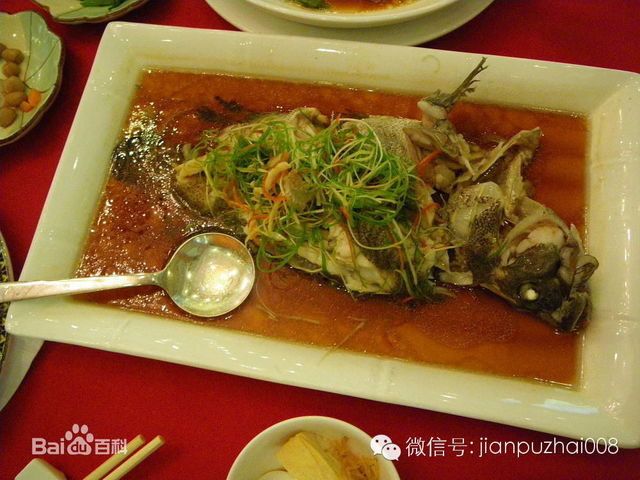 2.用长盘1个,横架上筷子两根,将鱼放上,撒上姜丝,用花生油10克淋在鱼身上,放入蒸笼。余油和豉油皇汁用碗盛载也一同放入蒸笼,以旺火蒸约8分钟至刚熟,取出,撒上葱丝,淋上熟油和豉油皇汁即可上席。