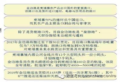 表1:柬埔寨西哈努克港的主要情况 主要事项 | | 基本情况 | | 交通发达 | 铁路可直达首都金边,全长270km;位于港市之西北,临泰国湾;该国西南部磅逊湾 南口东岸。港外,至泰国梭桃邑港218海里,至越南港胡志明港420海里,至新加坡港603海里,至中国广州港1210海里 | 工业区 | | 机场 | 有东南亚最大国际机场之一的波成东机场,距港口约250km |