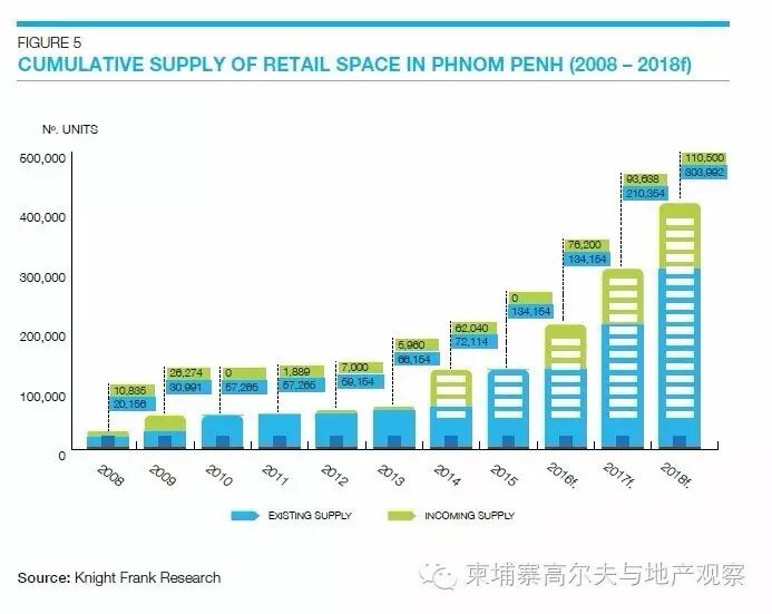 自2014年下半年安达大厦商业部分完工投入使用以来,迄今两年内没有新的零售商场投入市场,金边市商业地产面积总量一直停留在134153平米。2016年年底前随着百盛商场以及Exchange Square的峻工,76200平米的新商业零售面积将投入市场。如下图,如果所有计划与建设中的项目都如期进行的话,到2020年总商业购物地产面积会达到414492平米,相当于在今天的基础上增长209% 金边市商业购物中心累计供应面积;蓝色为已有,绿色为即将投入使用。 来源:KnightFrank Research 高端购物中心出租率维持在95.8%,其中永旺商场长期满租并且有意向商家排队等候租位空出。各购物中心虽然出租率高,但租位的商家替换率也高,基本趋势是高端品牌渐渐被平民品牌代替。永旺商场二期也已在城西北韩国城附近开始动工。 加华集团正计划重新翻修与重新定位苏利亚购物中心,加入更多的商区与提高商铺的多样化,令较早一代的商场仍然保持与时俱进。 另外两个动向是,诸如Krispy Kreme、Carl’s Junior等世界一线食品与饮品品牌也开始进入金边;星巴克在机场开设第一家店后,半年内在永旺商场成功开设二店。 出租与价格 高端商场的租金一直维持在$32-70/平米/月之间,中端商场内品牌商铺的租金在$10-22,而非品牌商铺租金从$22-250/平米/月不等。自从永旺商场开业,众多老一辈商场们纷纷受到出租形势的冲击。 前景