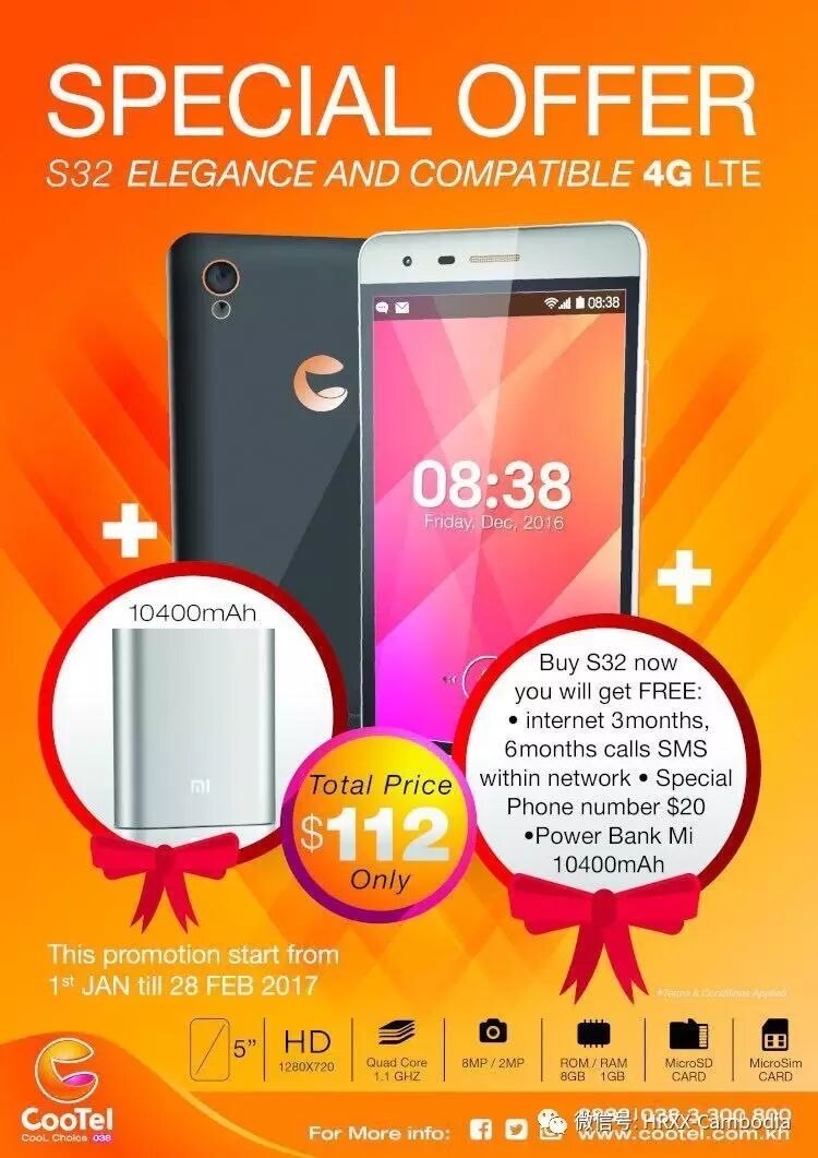为满足从功能机到智能机换机手机用户及中低端智能机用户需求,COOTEL公司推出四核双模高清智能手机S32,既可以上网浏览网页、使用社交媒体(Facebook,YouTube等)也可以高清拍照,为让用户方便使用这款智能手机,特从2017年1月1日-2月28日开展促销活动,用户只需花费112美元就可以购买一部S32智能手机,同时可以免费获得小米充电宝(10400Ah)一部,享受数据上网3个月,6个月网内无限语音及短信及COOTEL价值20元的特别靓号一个。详询:8888/0383300800