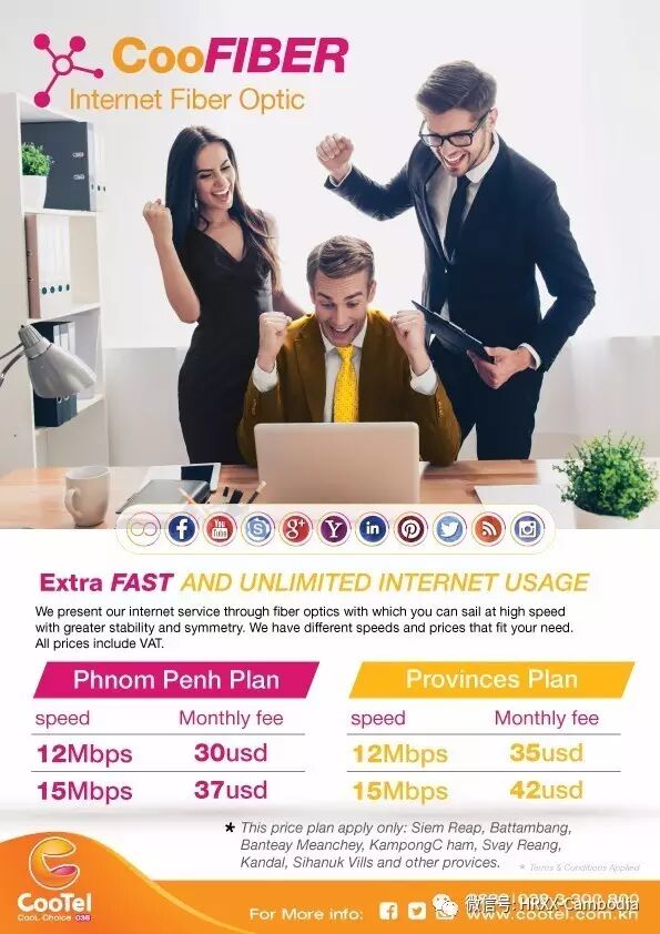 为满足中小企业快速互联网接入上网需求,COOTEL公司推出CooFIBER中小企业光纤套餐品牌。在金边分别是12M每月30美元套餐和15M每月37美元套餐,外省12M每月35美元套餐和15M每月42美元套餐,不限流量。详询:8888/0383300800